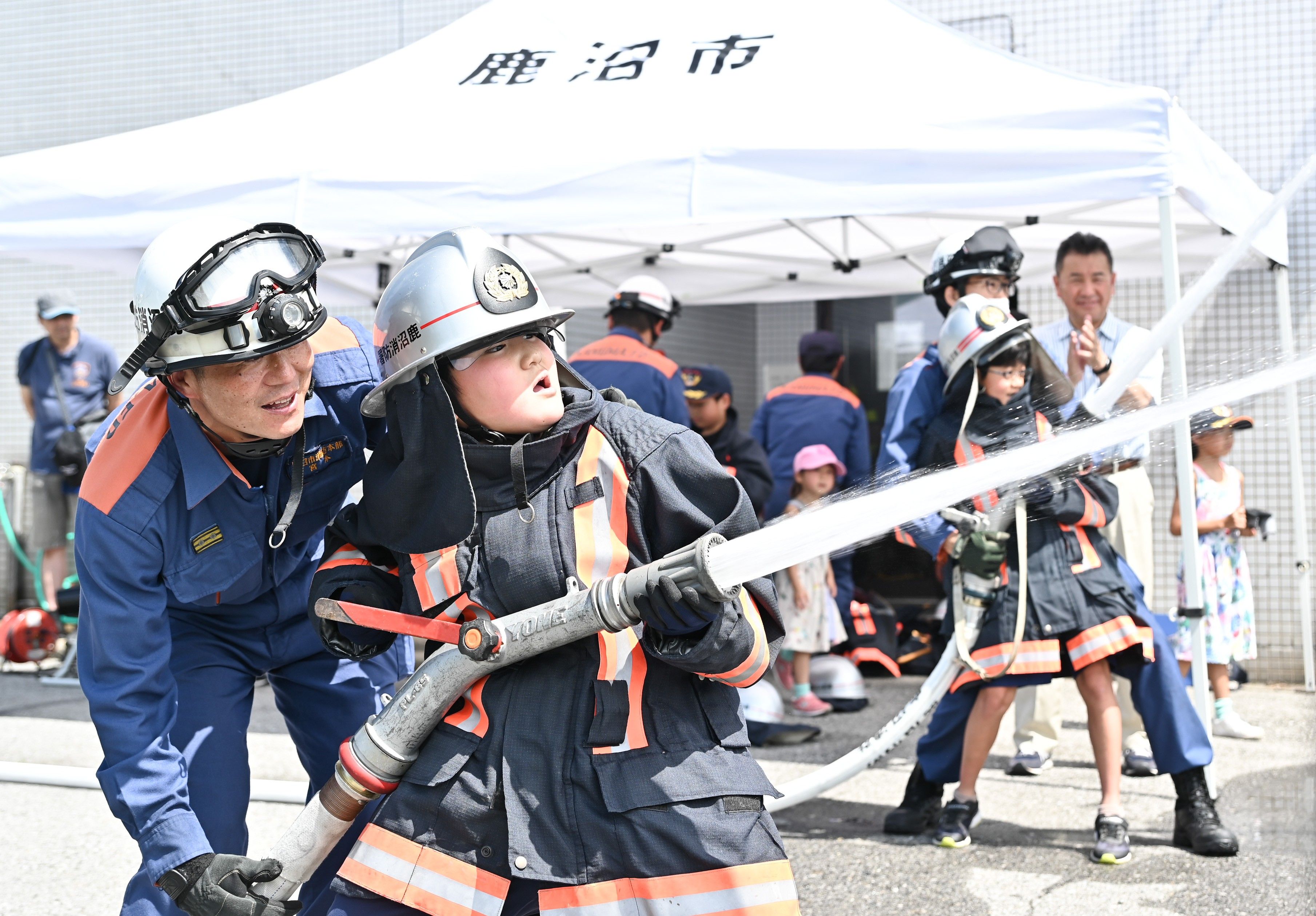 放水を体験する児童ら