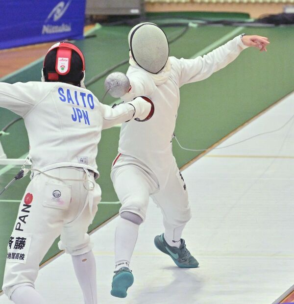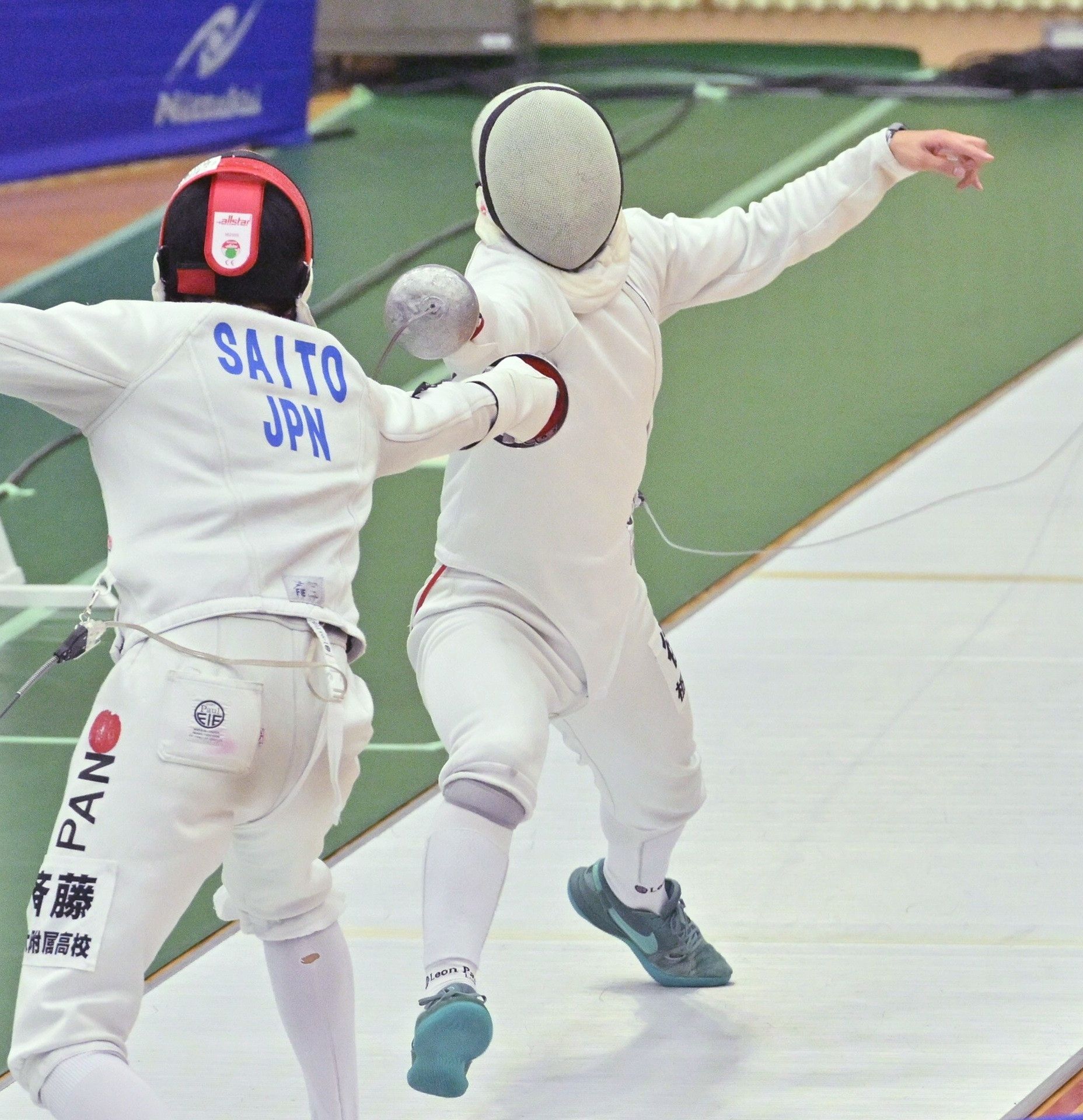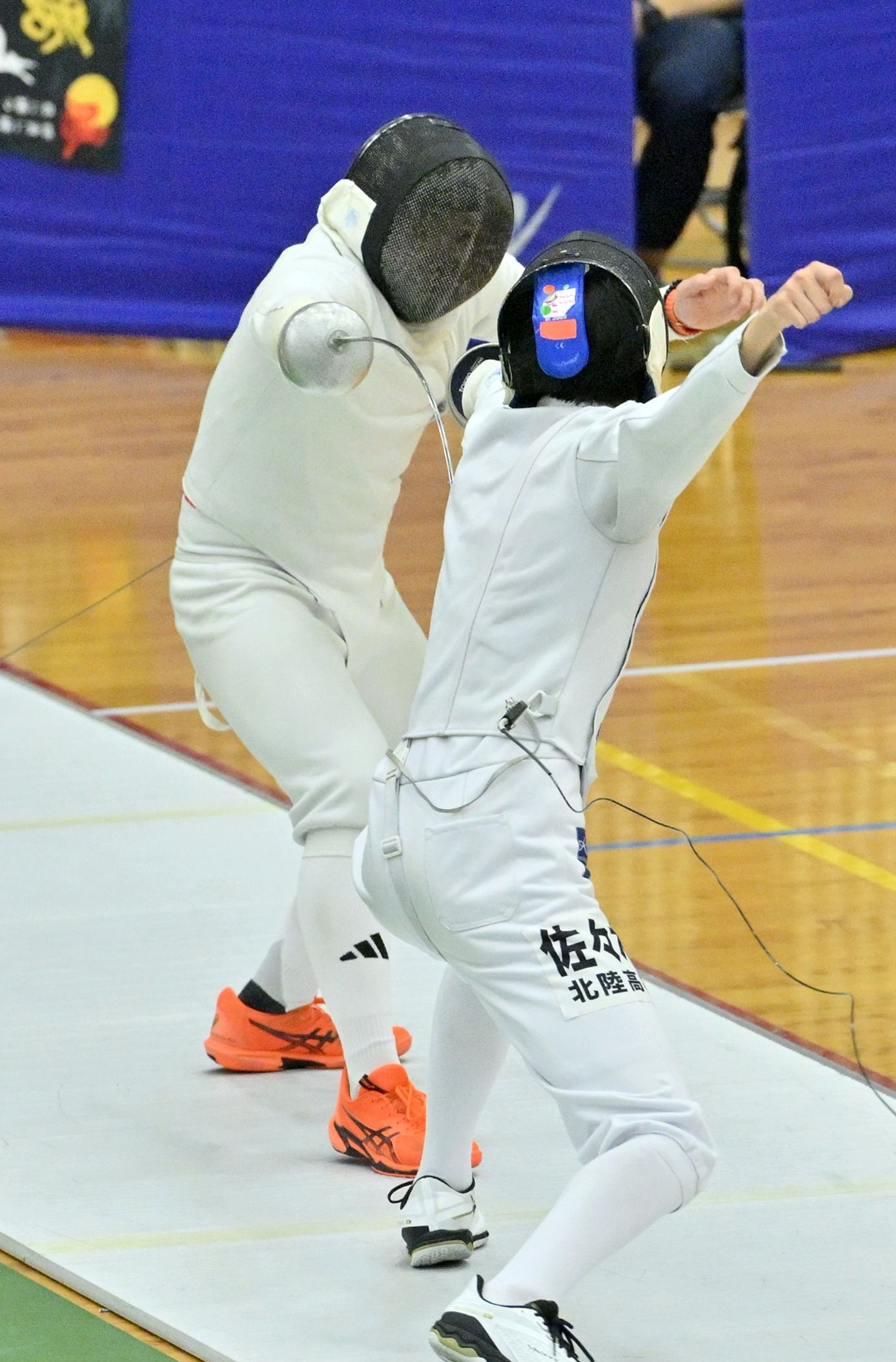 フェンシング男子エペ準々決勝 栃商の後藤(奥)が相手からポイントを奪う
