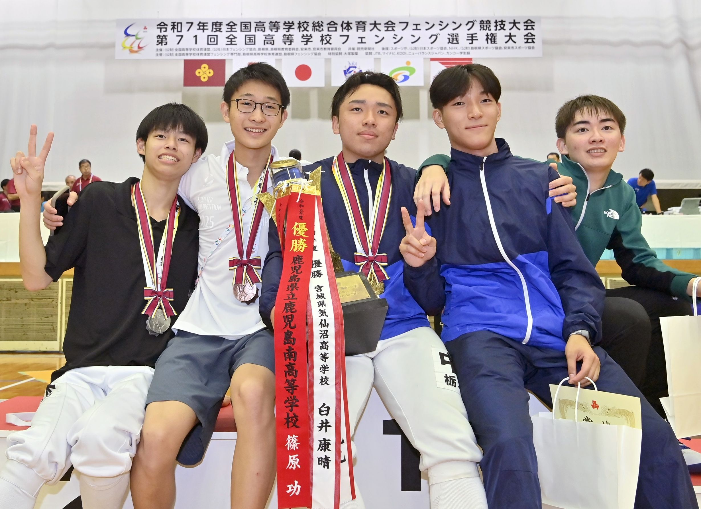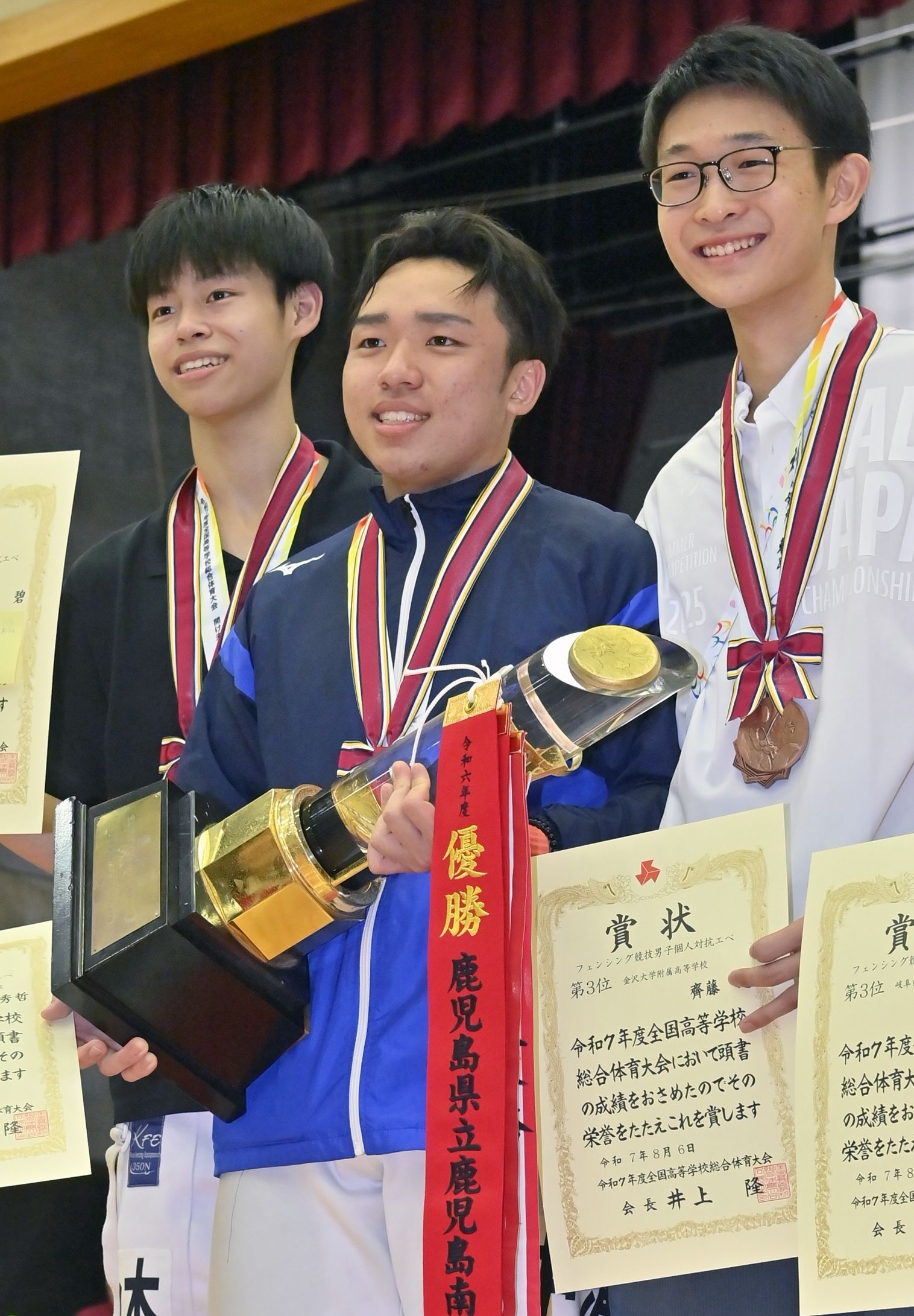 フェンシング男子エペで初優勝し、笑顔を見せる栃商の中浦(中央)=島根県安来市民体育館、広瀬華撮影