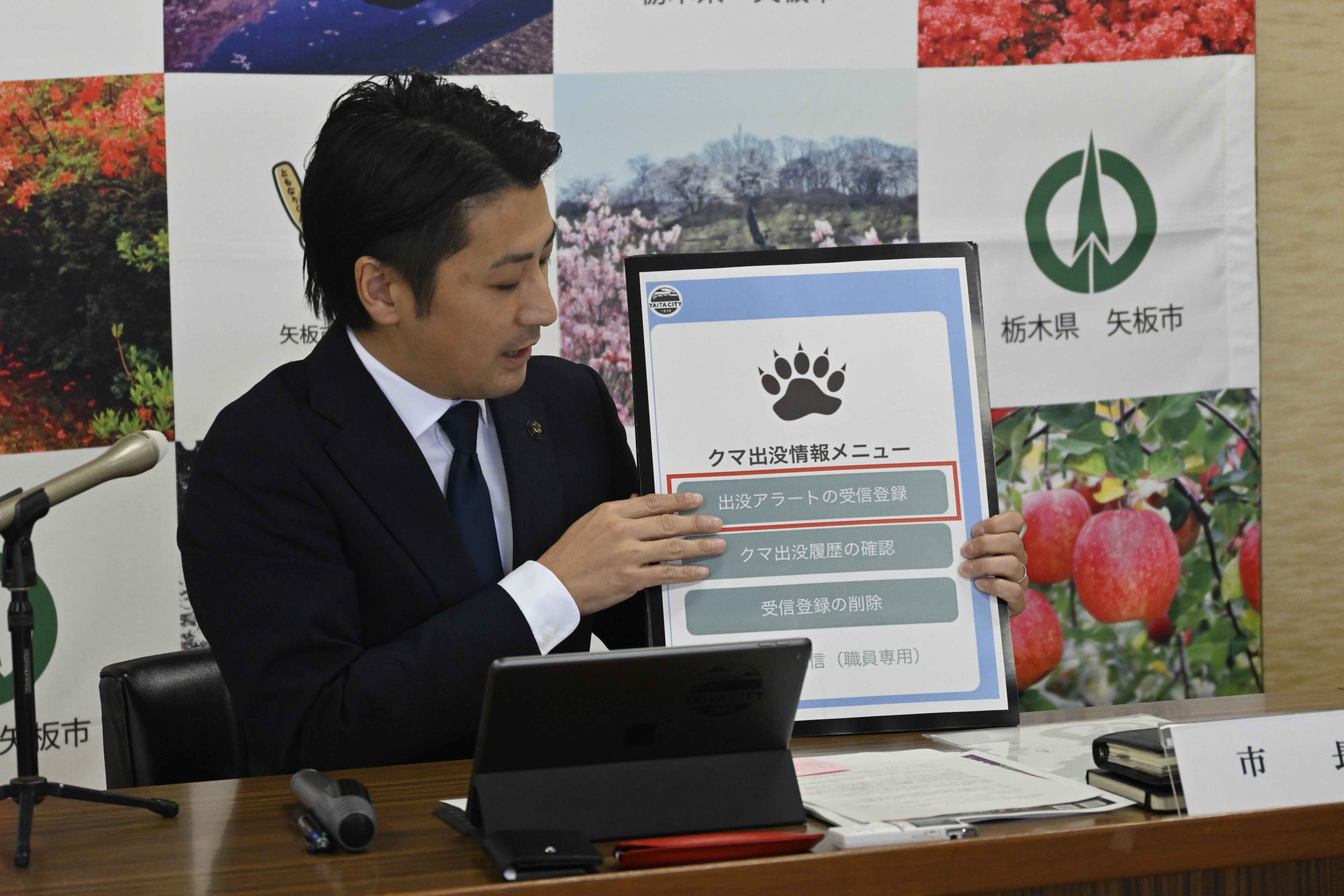 再選を目指して立候補を正式に表明する相馬氏=14日午後、大田原市役所