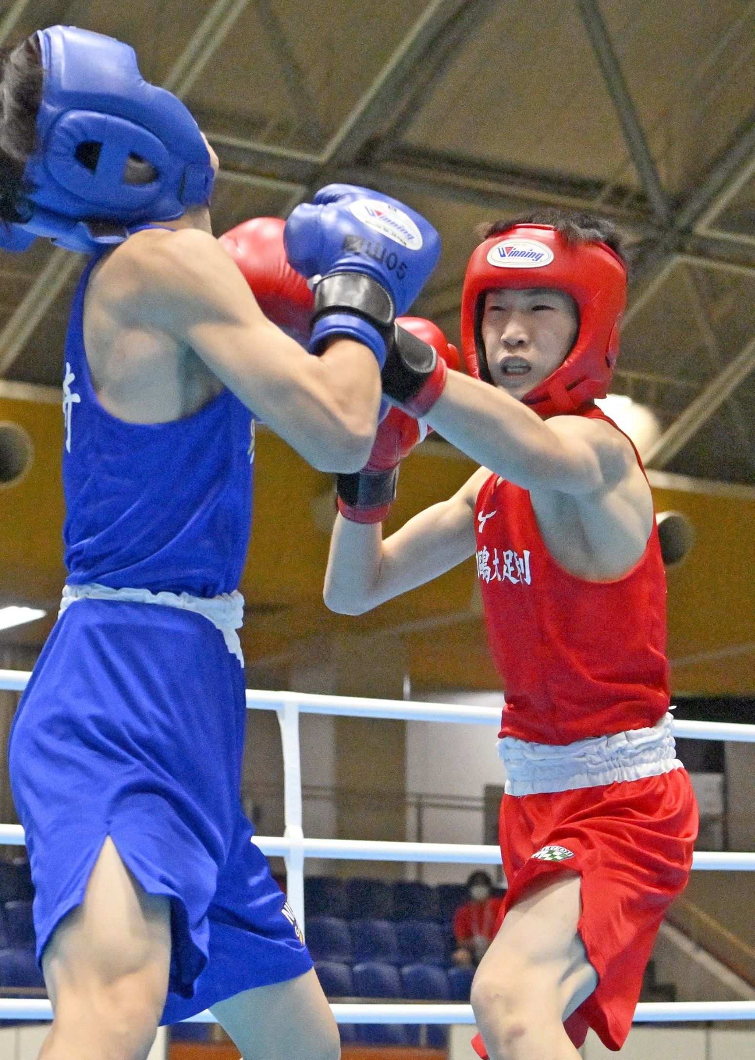 ボクシング男子ライトフライ級決勝 1回、白鴎足利の小林(左)が左ストレートを放つ=岡山県玉野市総合体育館、広瀬華撮影