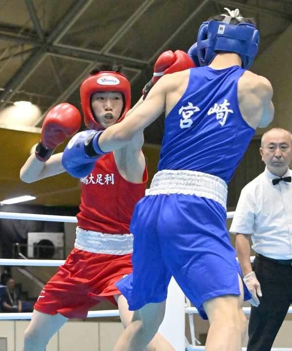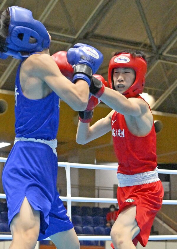 ボクシング男子ライトフライ級決勝 1回、白鴎足利の小林(左)が左ジャブを放つ