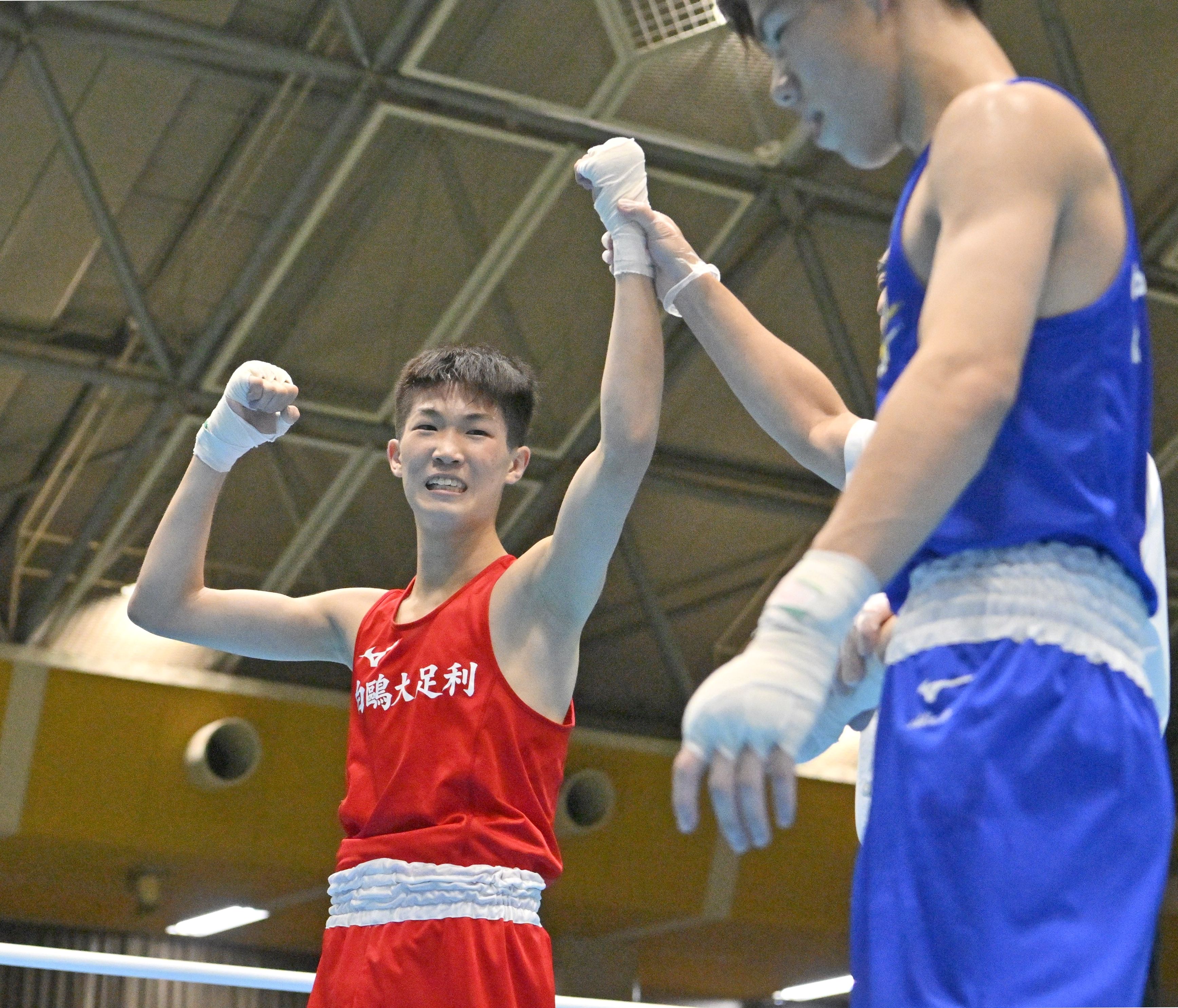 ボクシング男子ライトフライ級で優勝し、ガッツポーズする白鴎足利の小林(左)