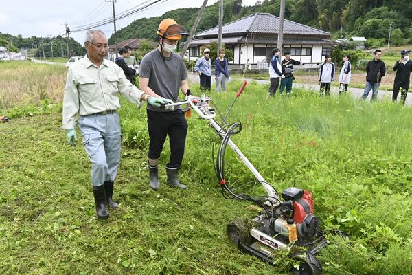 実ったブルーベリーを摘み取る子どもたち=14日午前9時50分、足利市田島町
