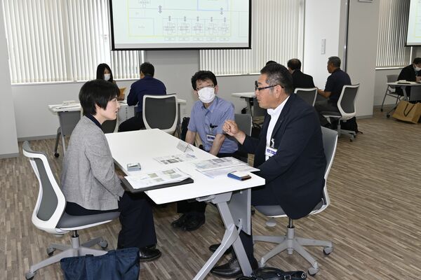 進路担当者(左)に事業概要などを説明する企業関係者ら=13日午後、宇都宮市