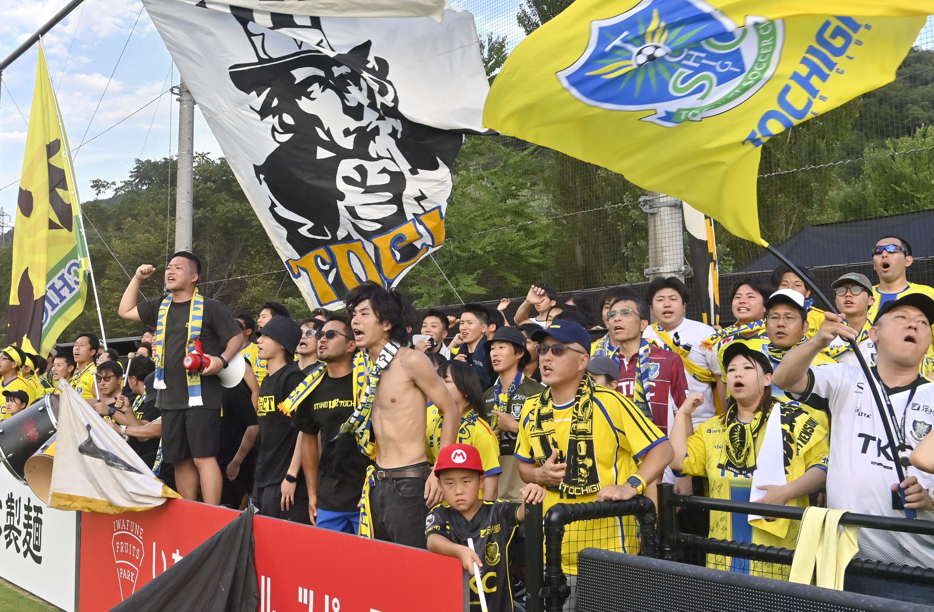 旗を振って選手たちを鼓舞する栃木SCのサポーターたち=26日午後5時20分