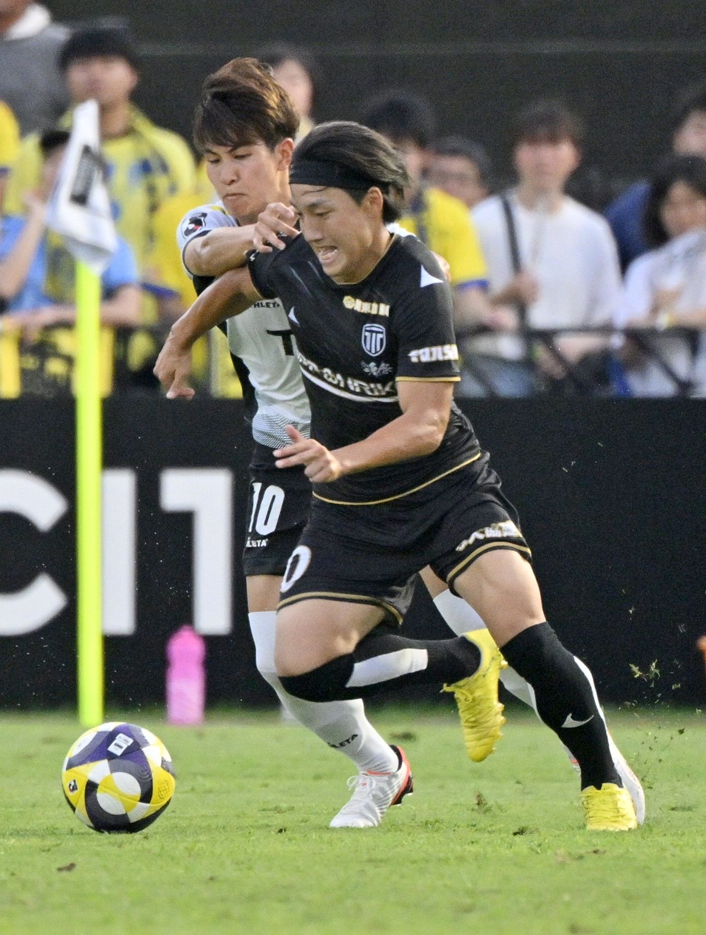 前半15分、栃木シティのMF岡庭(手前)が相手と激しく競り合う