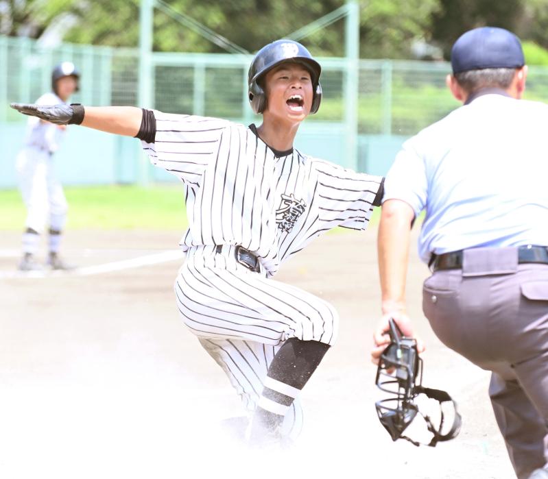 軟式野球決勝 若松原-陽南 2回、若松原7点目のホームを踏み、セーフをアピールする酒井=県営B球場