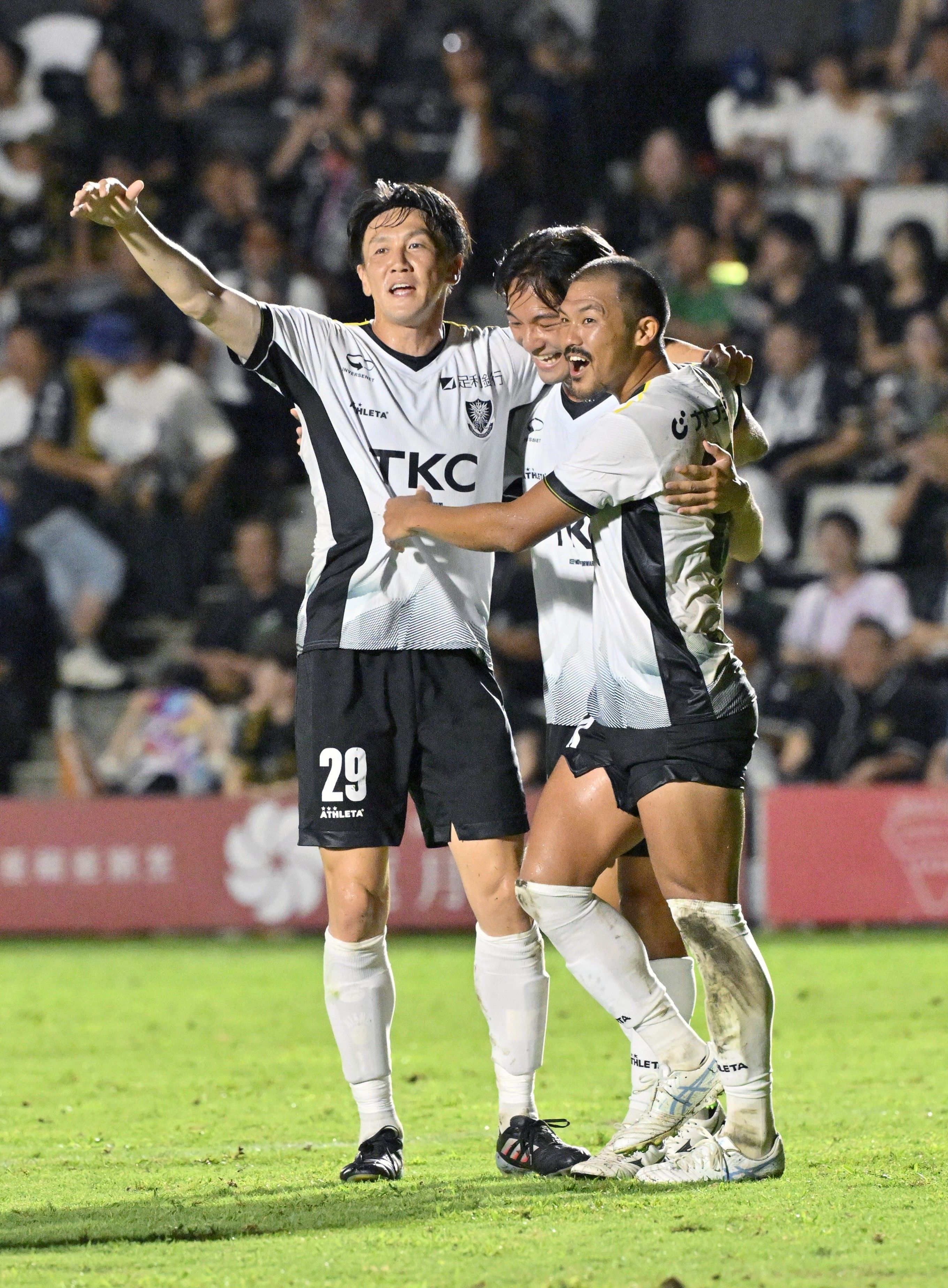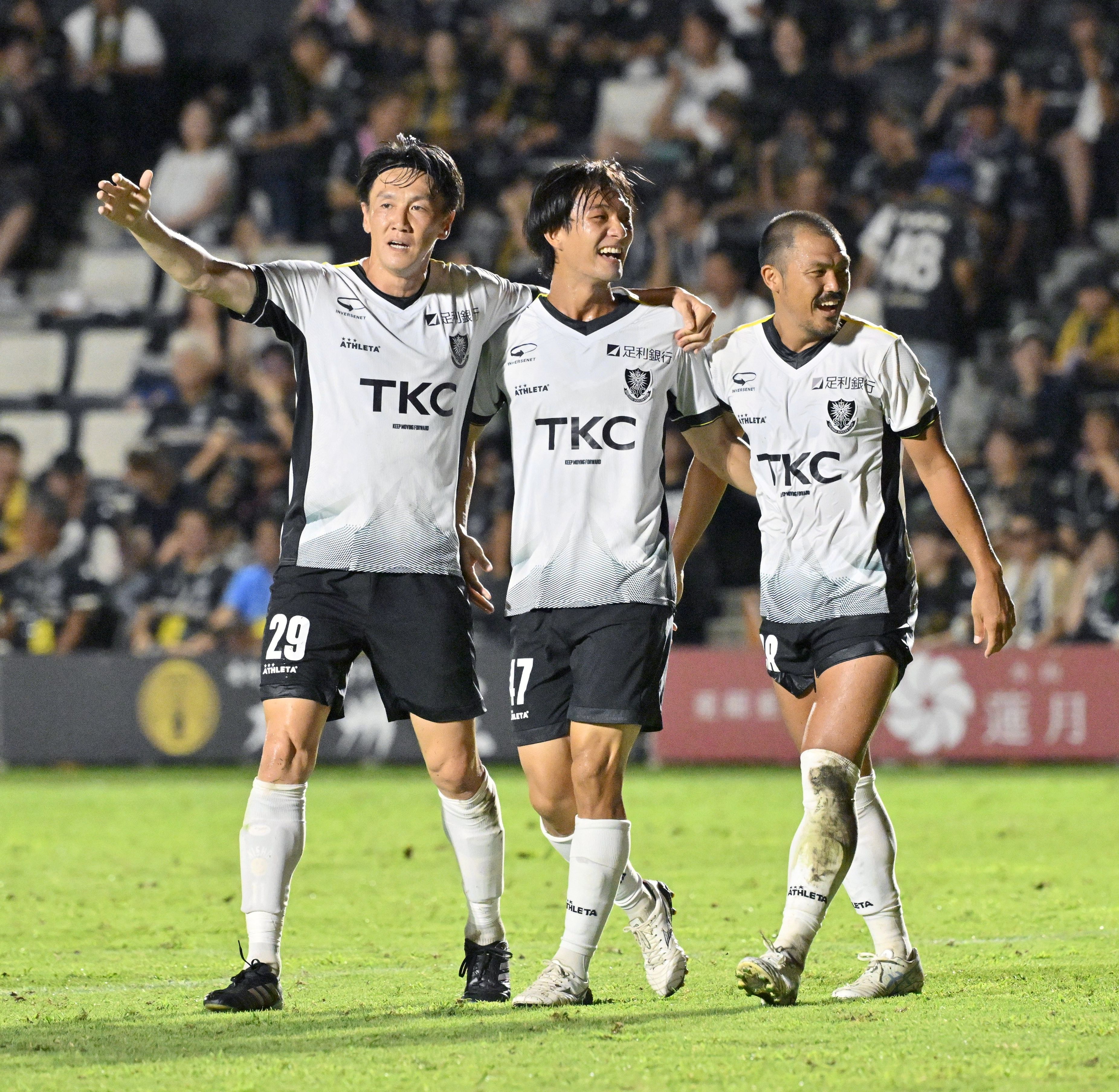 試合終了後、勝利を収めて笑顔を見せる栃木SCの選手たち