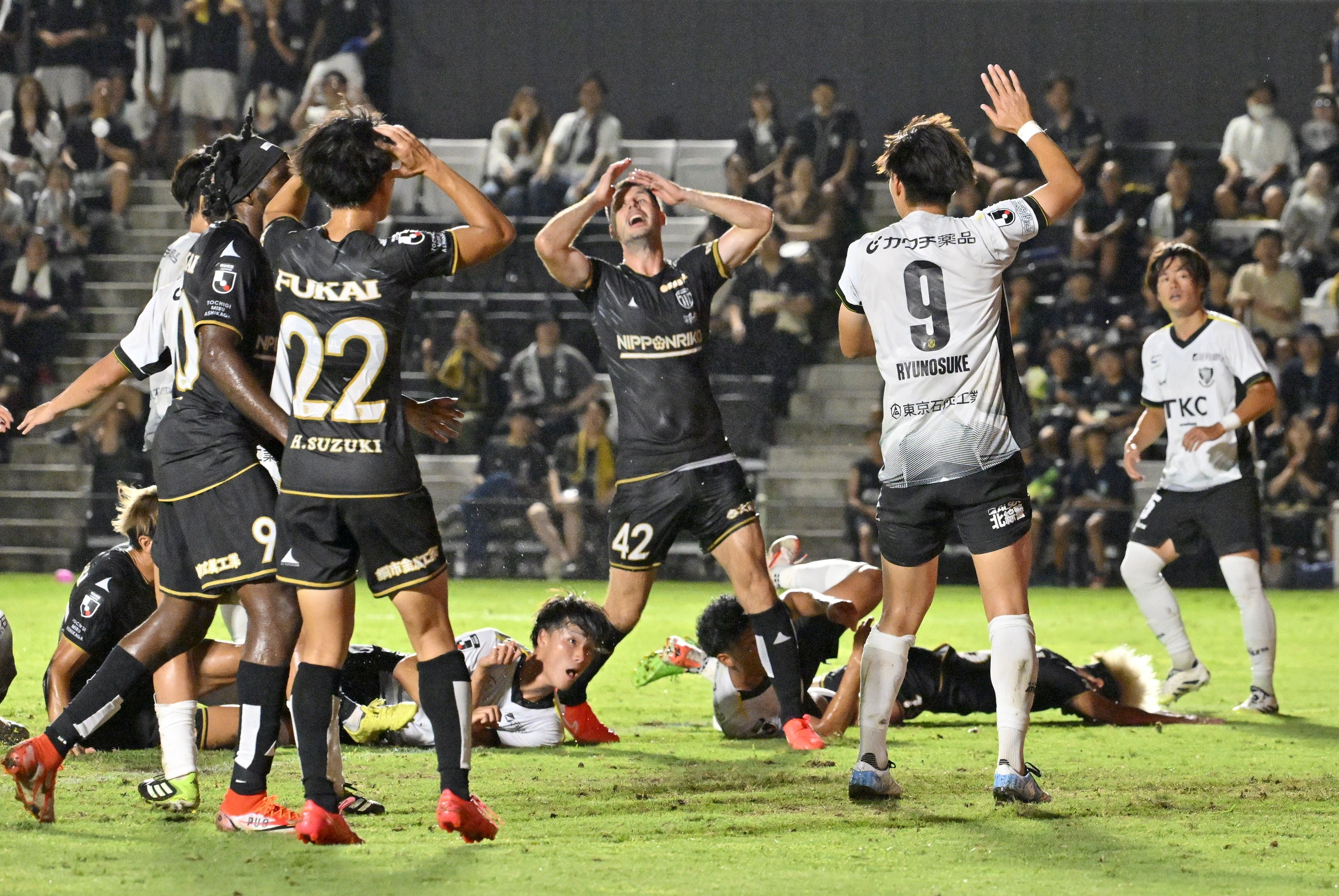 後半41分、味方のシュートが外れ、頭を抱える栃木シティのDFヨニッチ(中央)ら