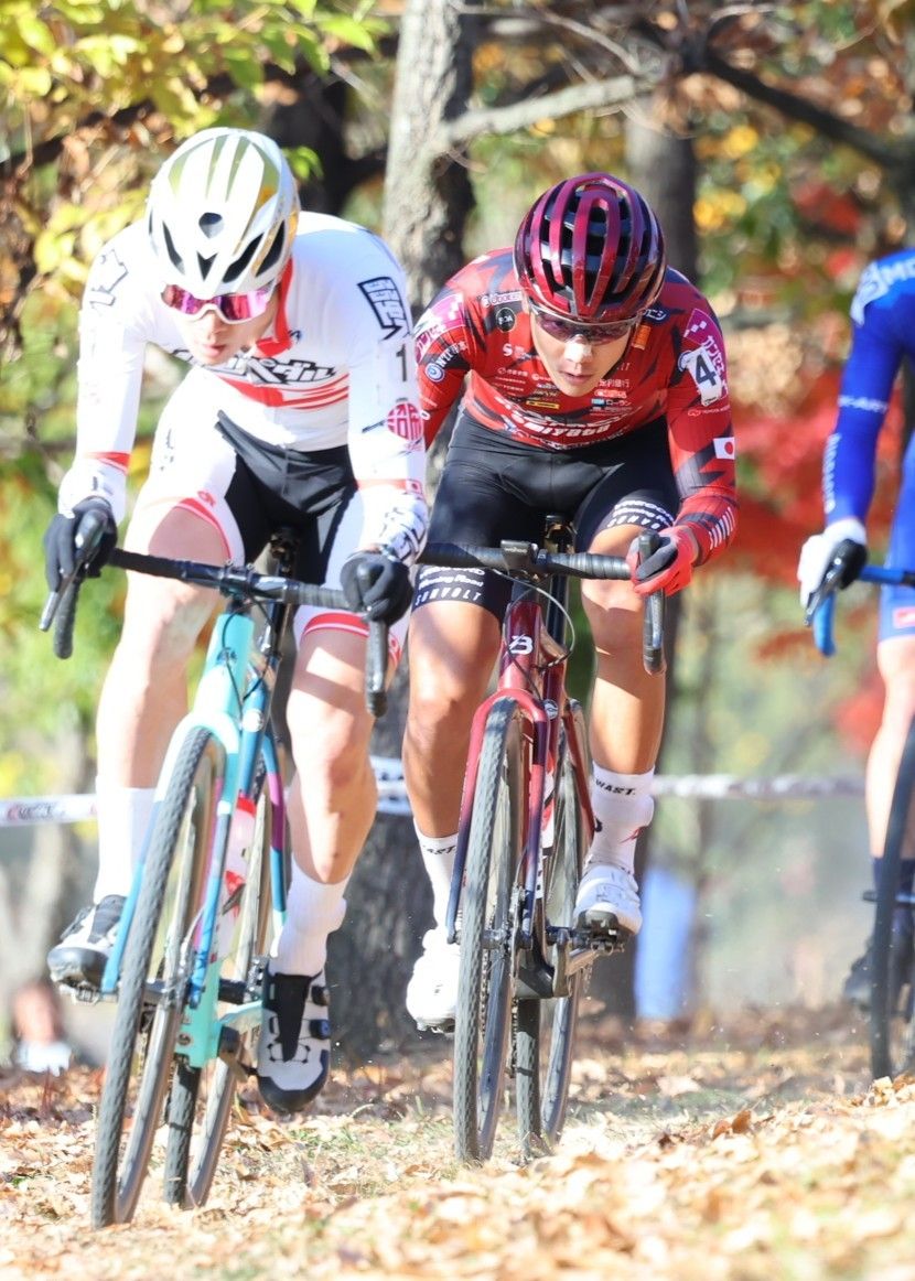 首位の織田(左)を追走するブリッツェンの沢田=埼玉県のまつぶし緑の丘公園特設コース