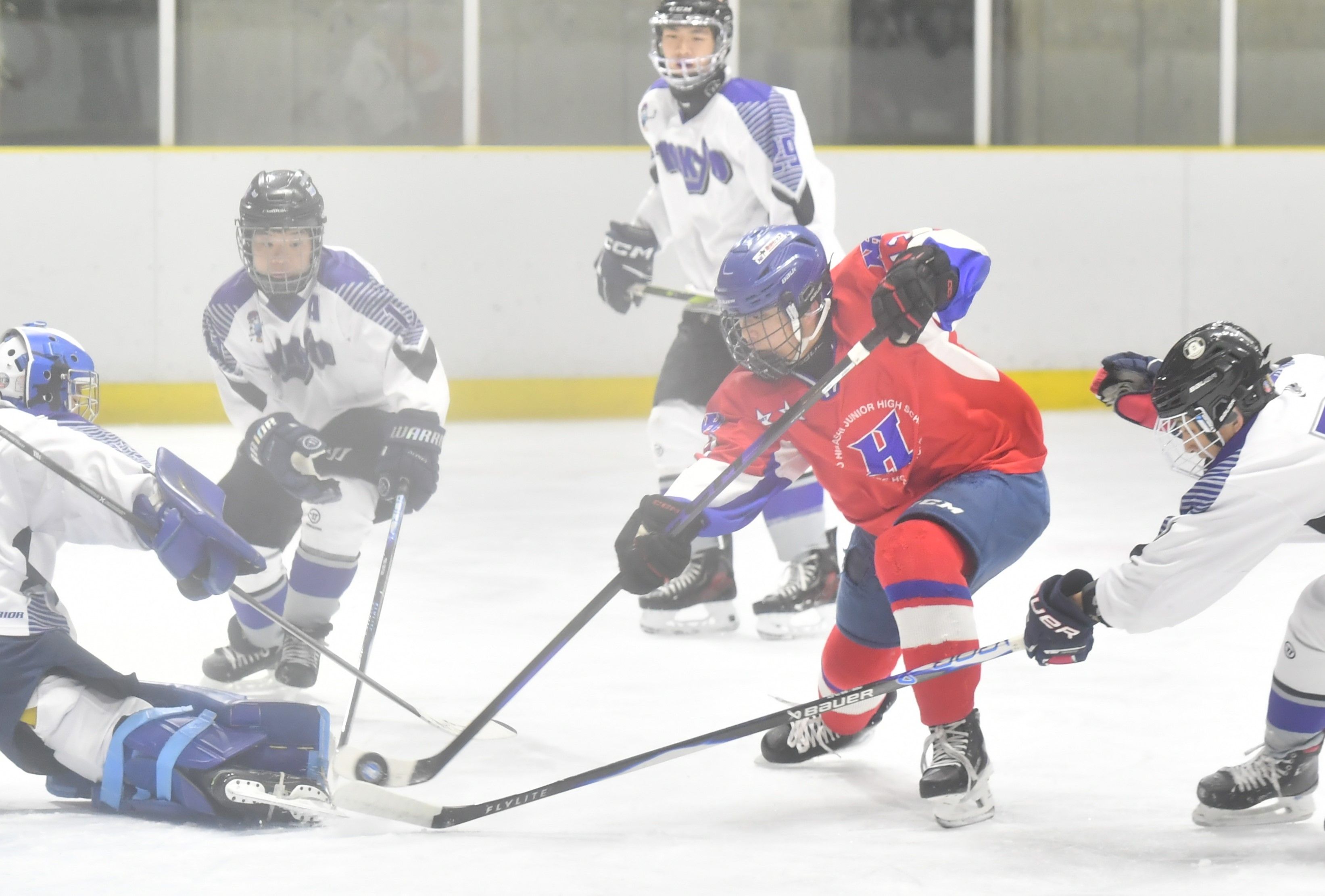 第1ピリオド2分56秒、日光東中クラブのFW深谷がシュートを決める=日光霧降アイスアリーナ、鈴木久崇撮影