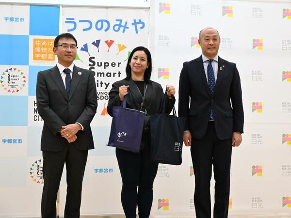 瀬高市長(右)と田中副市長(左)から歓迎を受けるジャオさん