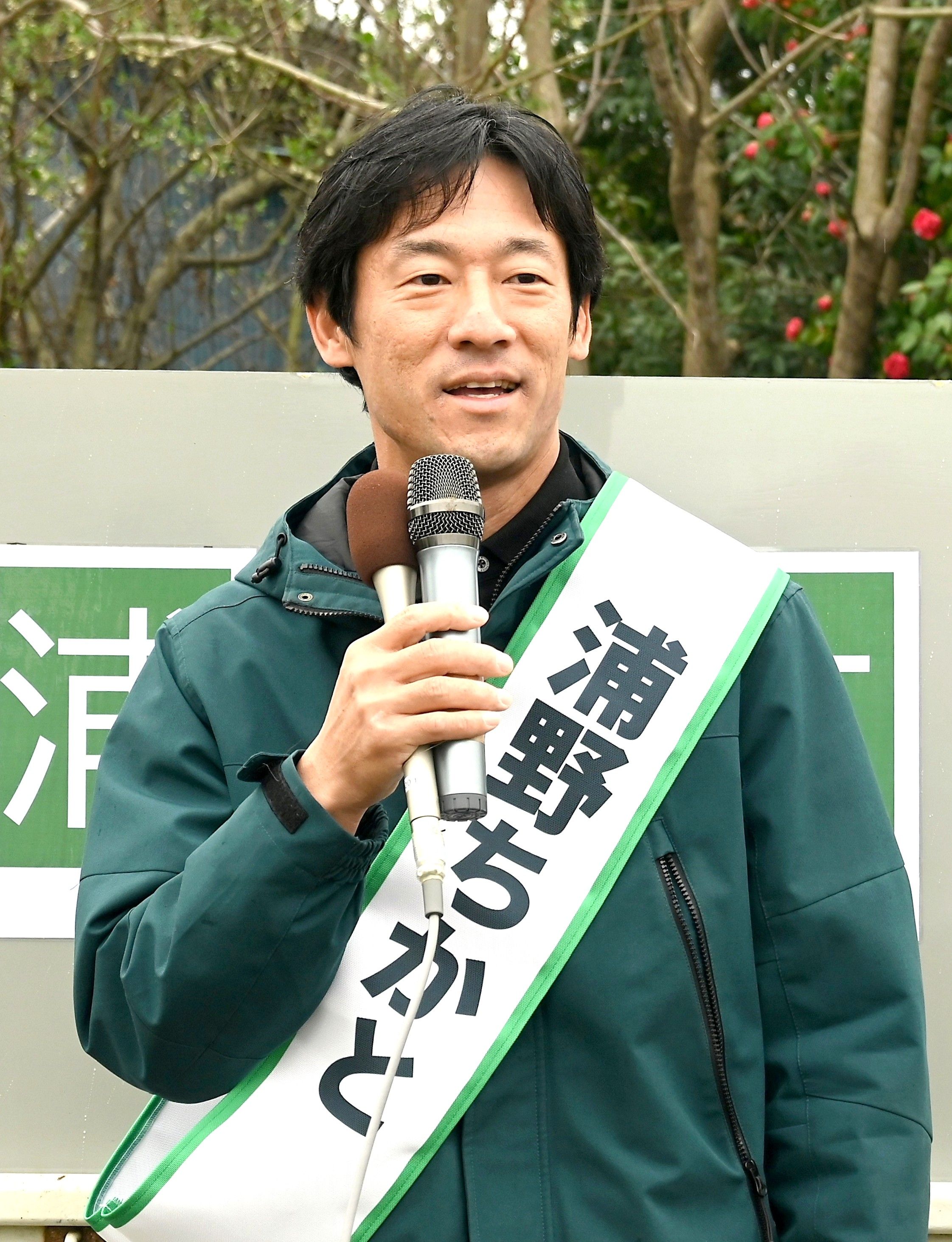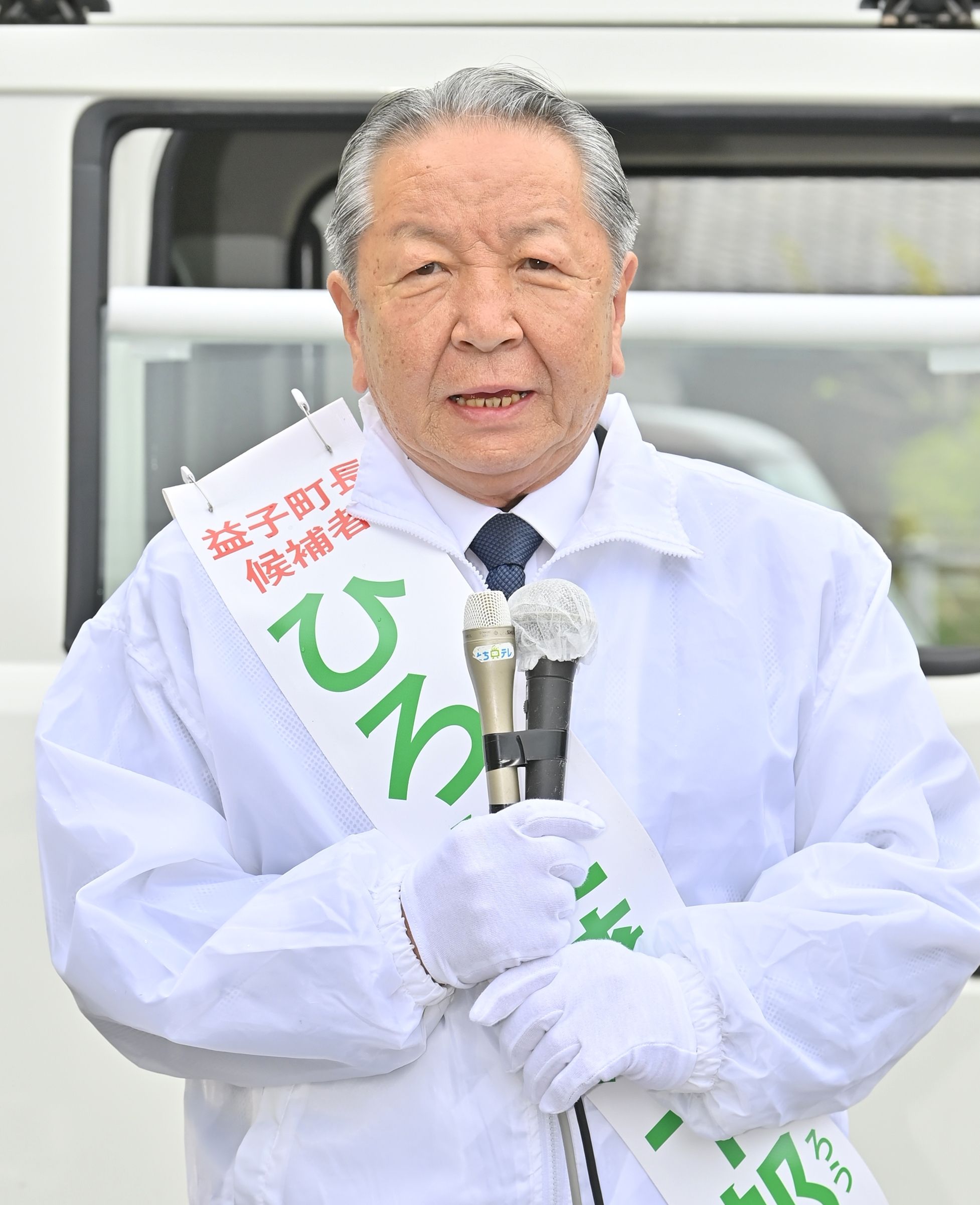 第一声を放つ橋本氏=7日午前10時10分、益子町益子