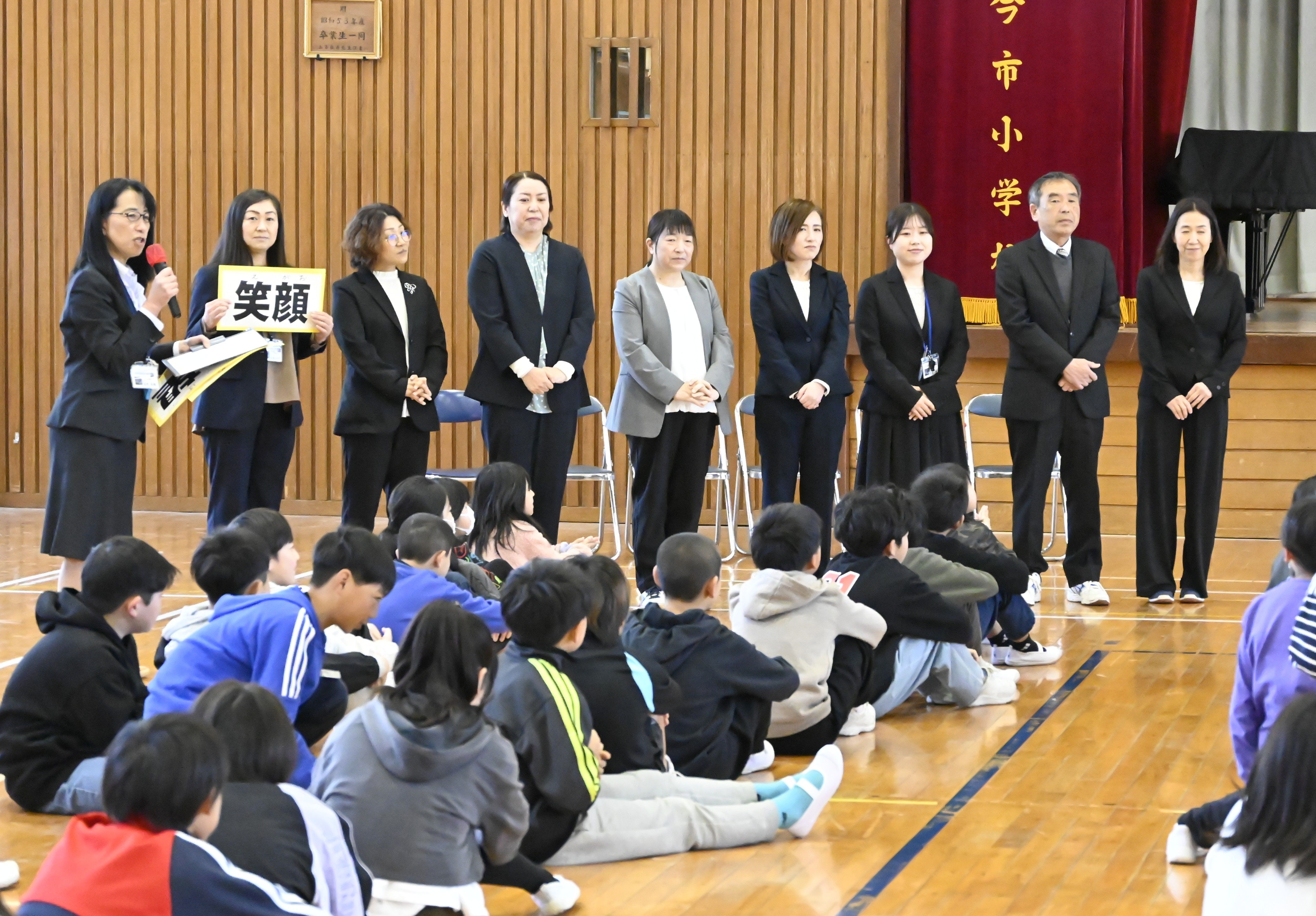 星野校長(左端)から紹介される1・2年生担当「チーム笑顔」の教員たち