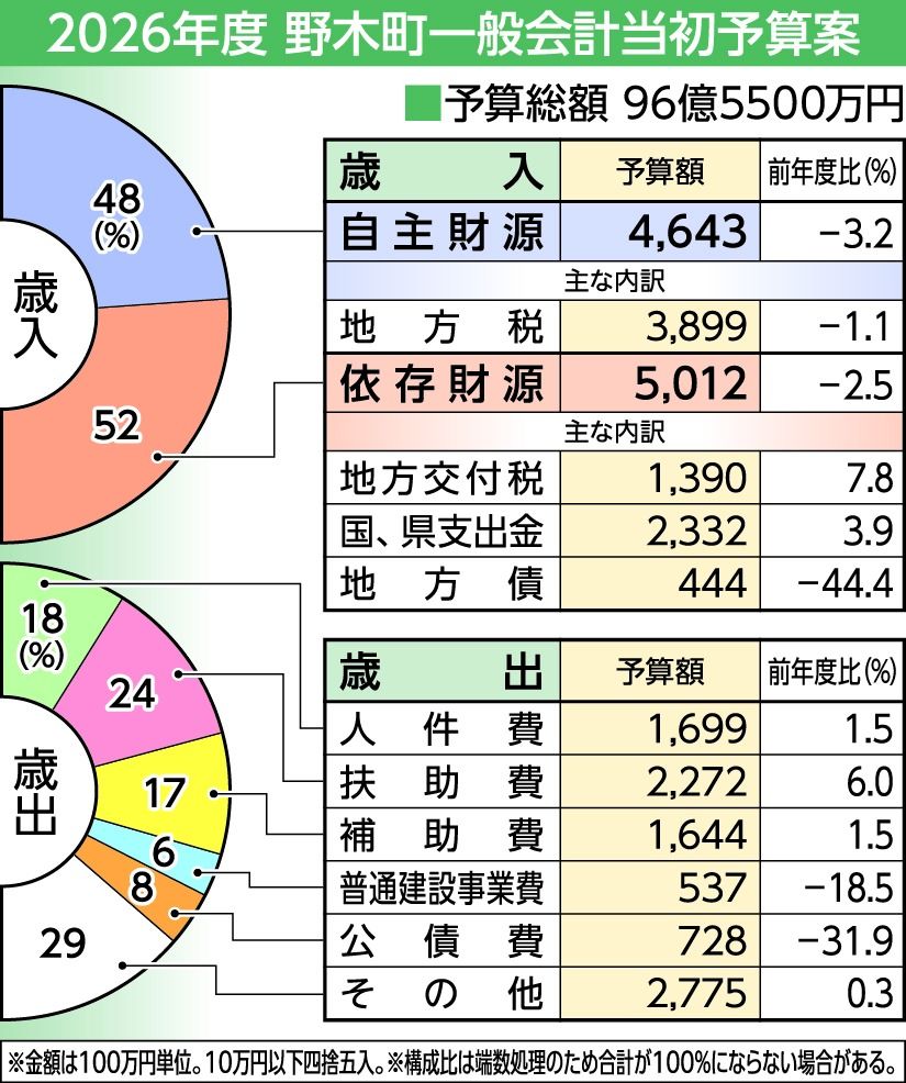 野木町2026年度当初予算案、安全・安心など3施策に重点 96億5500万円を計上