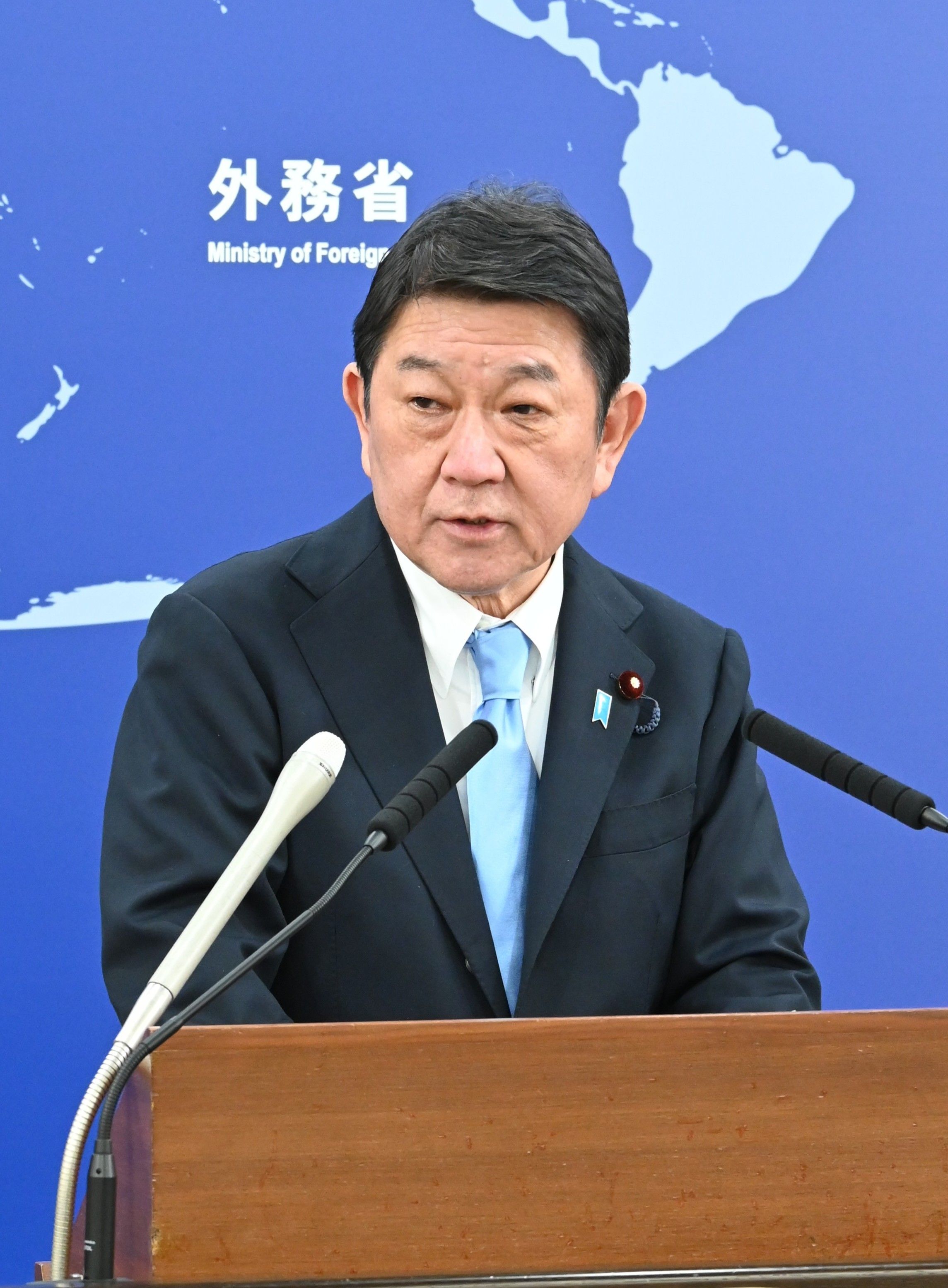 就任会見に臨む茂木外相=19日午後、外務省
