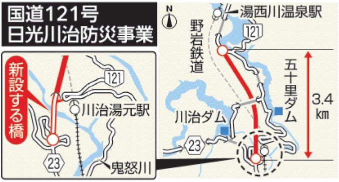 日光の国道121号バイパス整備が着工 川治温泉―五十里3.4km 鬼怒川の橋、全長300m架設を優先
