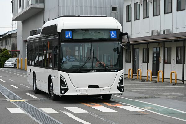工場敷地内を走行するエルガEV=23日午前、宇都宮市中岡本町