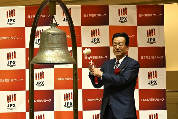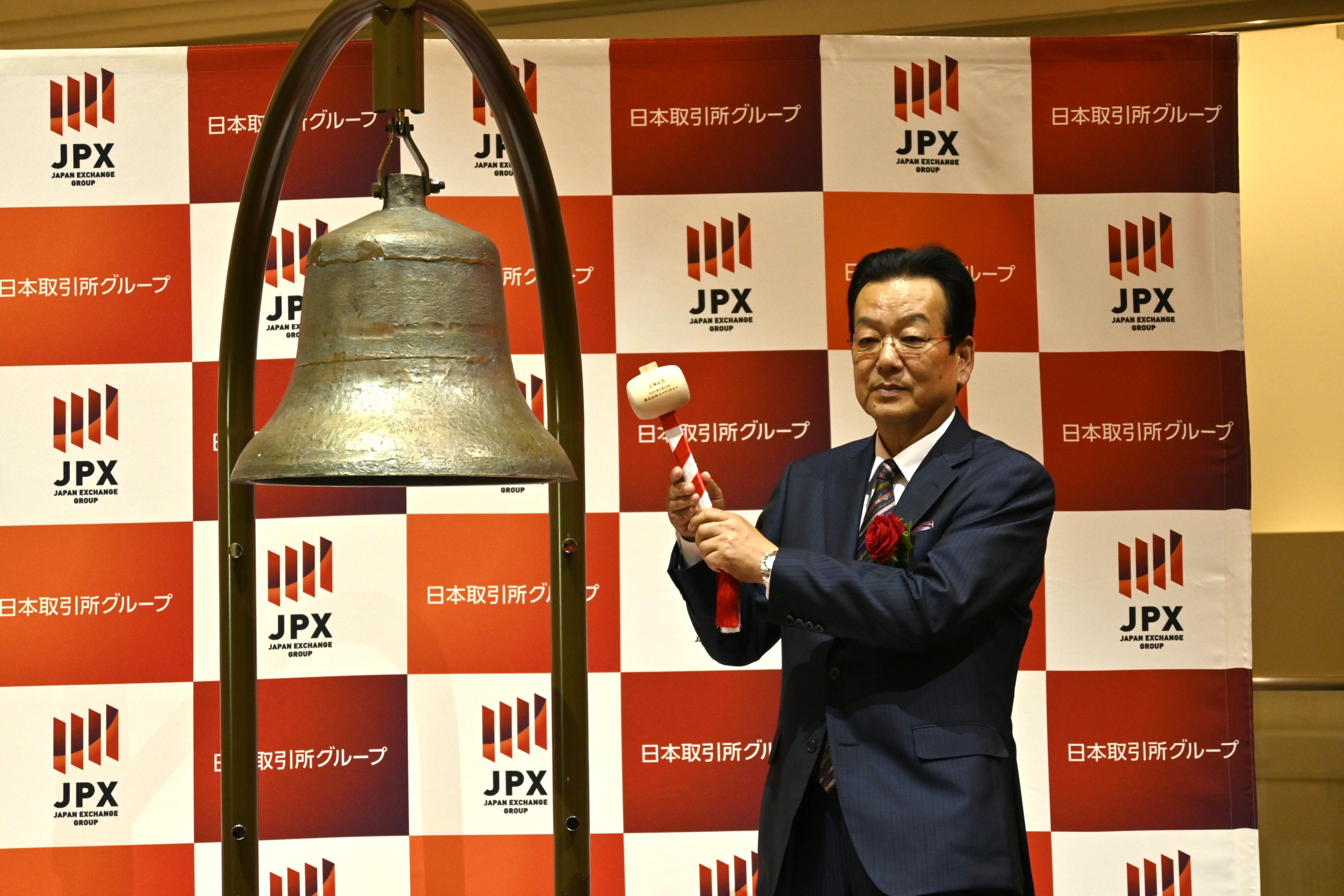 上場を祝い鐘を打つ藤川社長=23日午後、東京都内