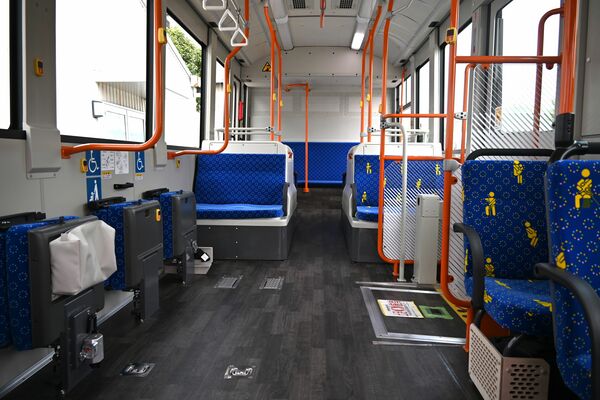 フルフラットを実現した「エルガEV」の車内=23日午後、宇都宮市中岡本町