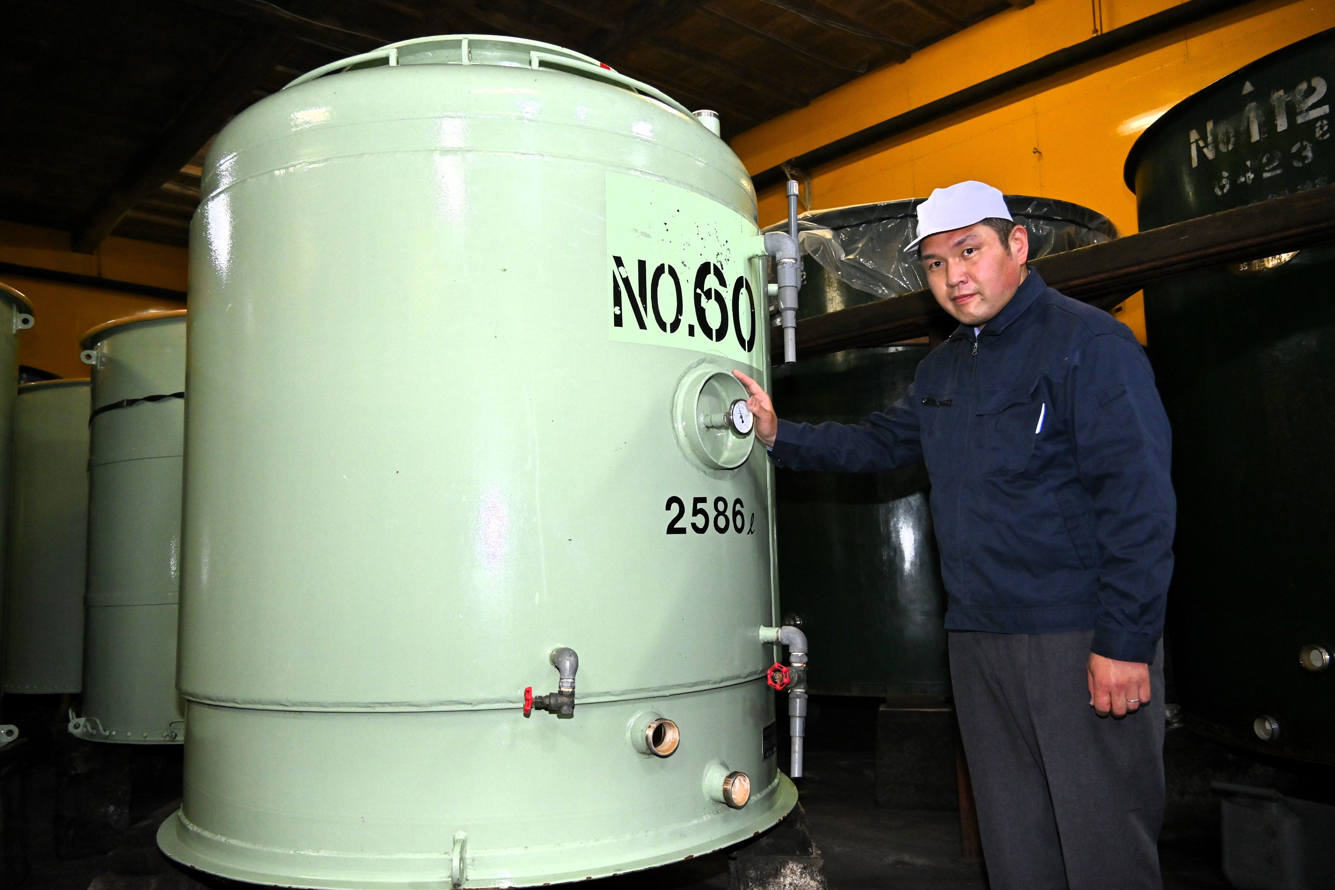 さらなる技術の向上を誓う惣誉酒造の河野社長(右)と秋田杜氏=21日午後、市貝町