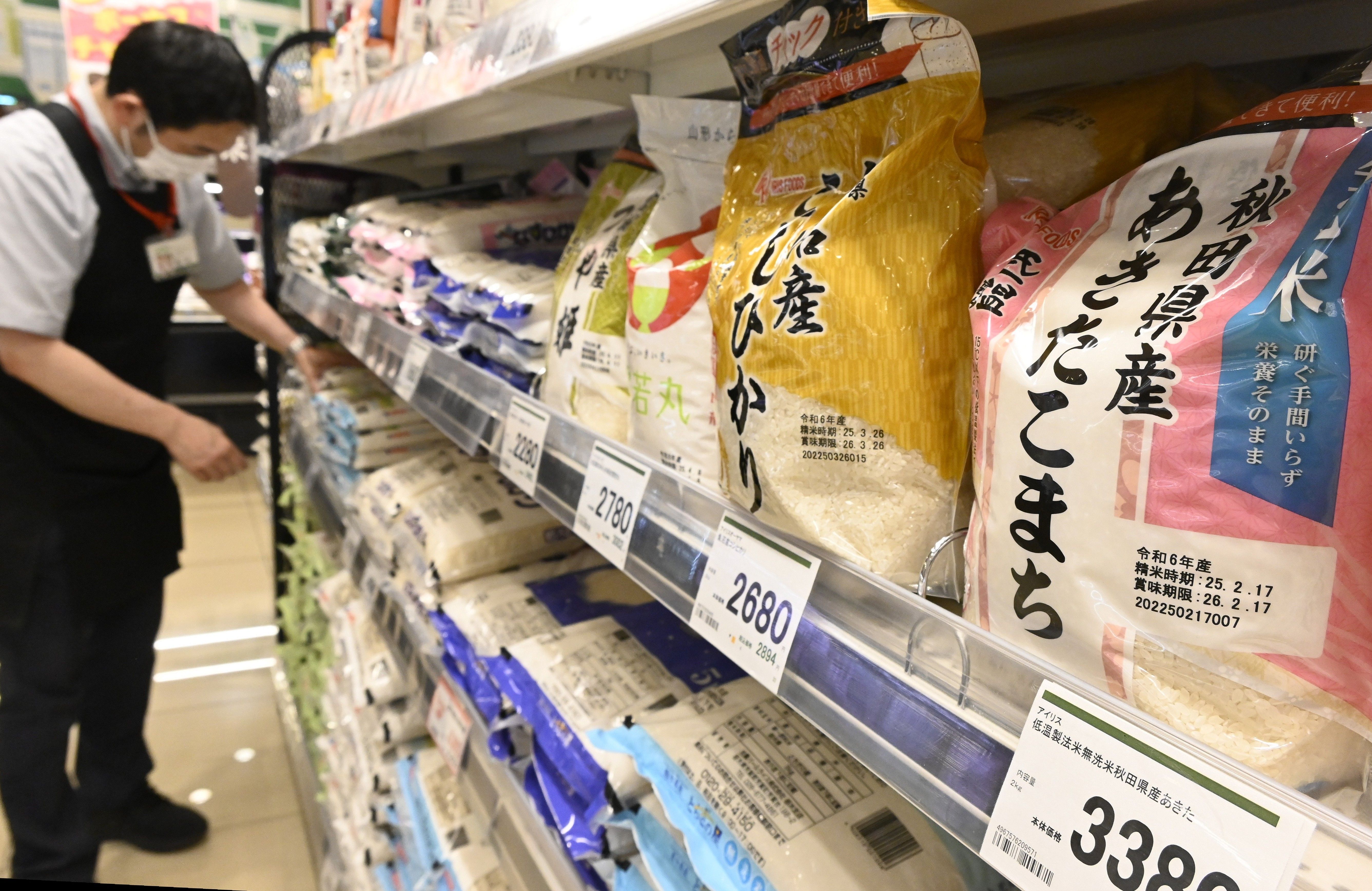 スーパーの売り場に並ぶコメ。米価は高止まりが続く=21日午後1時45分、宇都宮市鶴田町