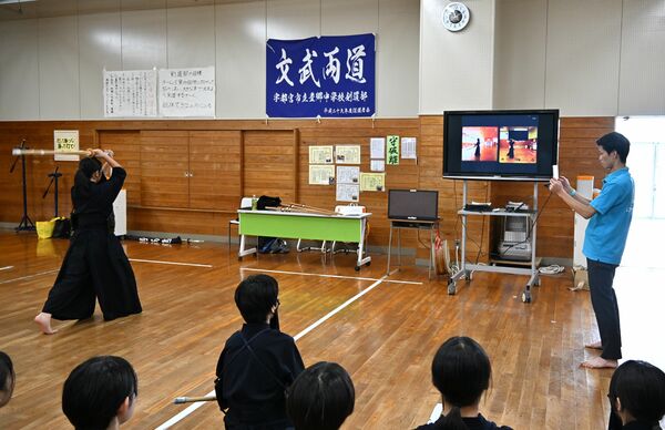 素振りの動画を通じてお手本の選手との違いを確認する生徒