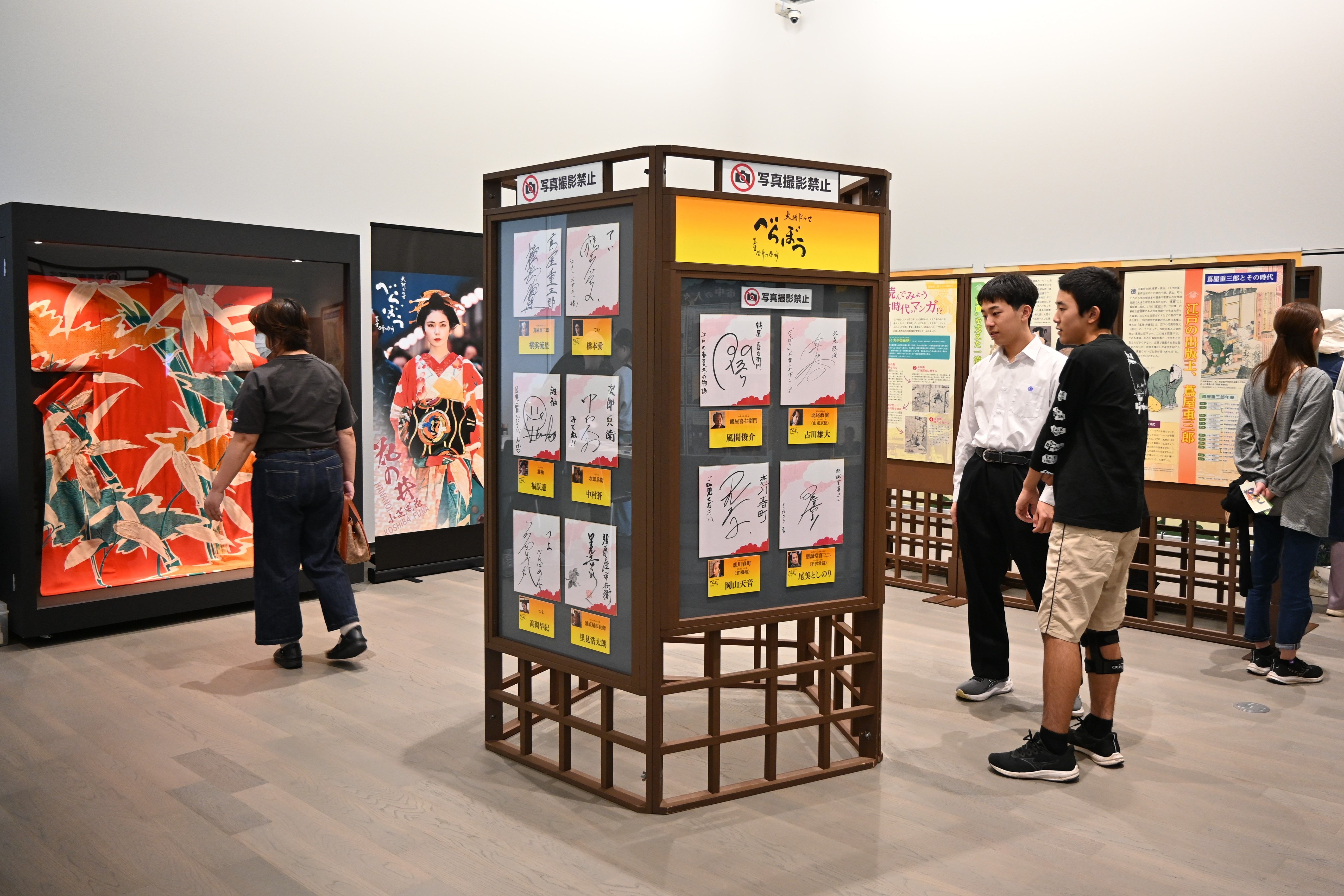 出演者のサイン色紙や衣装が並ぶ展示会場