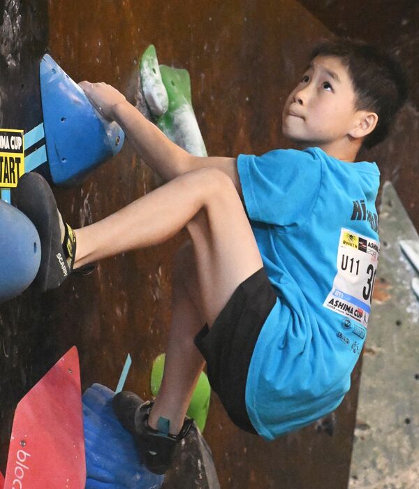 女子U13決勝 第3課題を攻略する山本(ゼロ宇都宮)=クライミングジム「ロッキン」