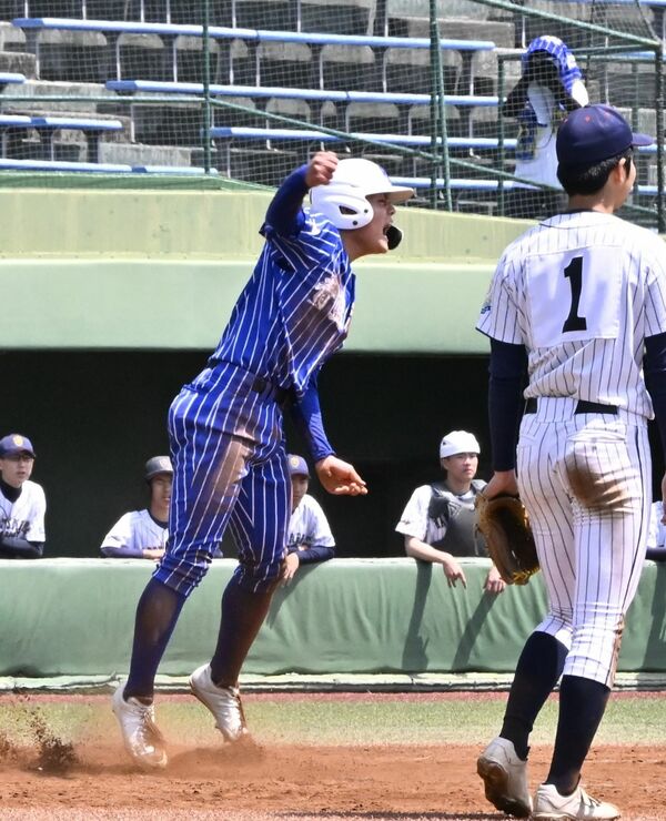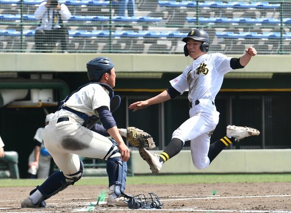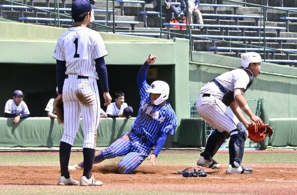 9回、青藍泰斗の三走・服部が白土の犠飛で勝ち越しの生還=清原、大和田美黎撮影