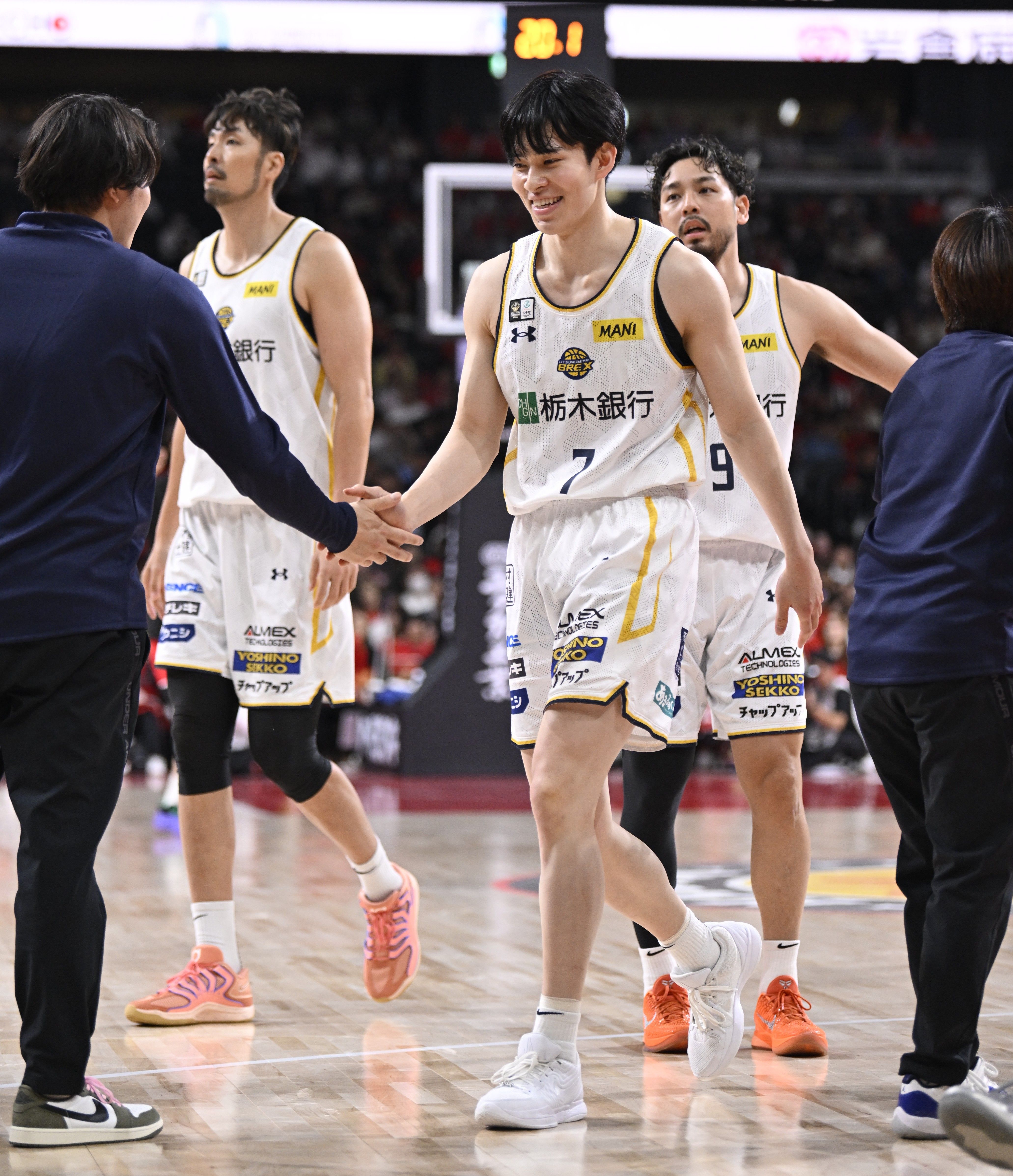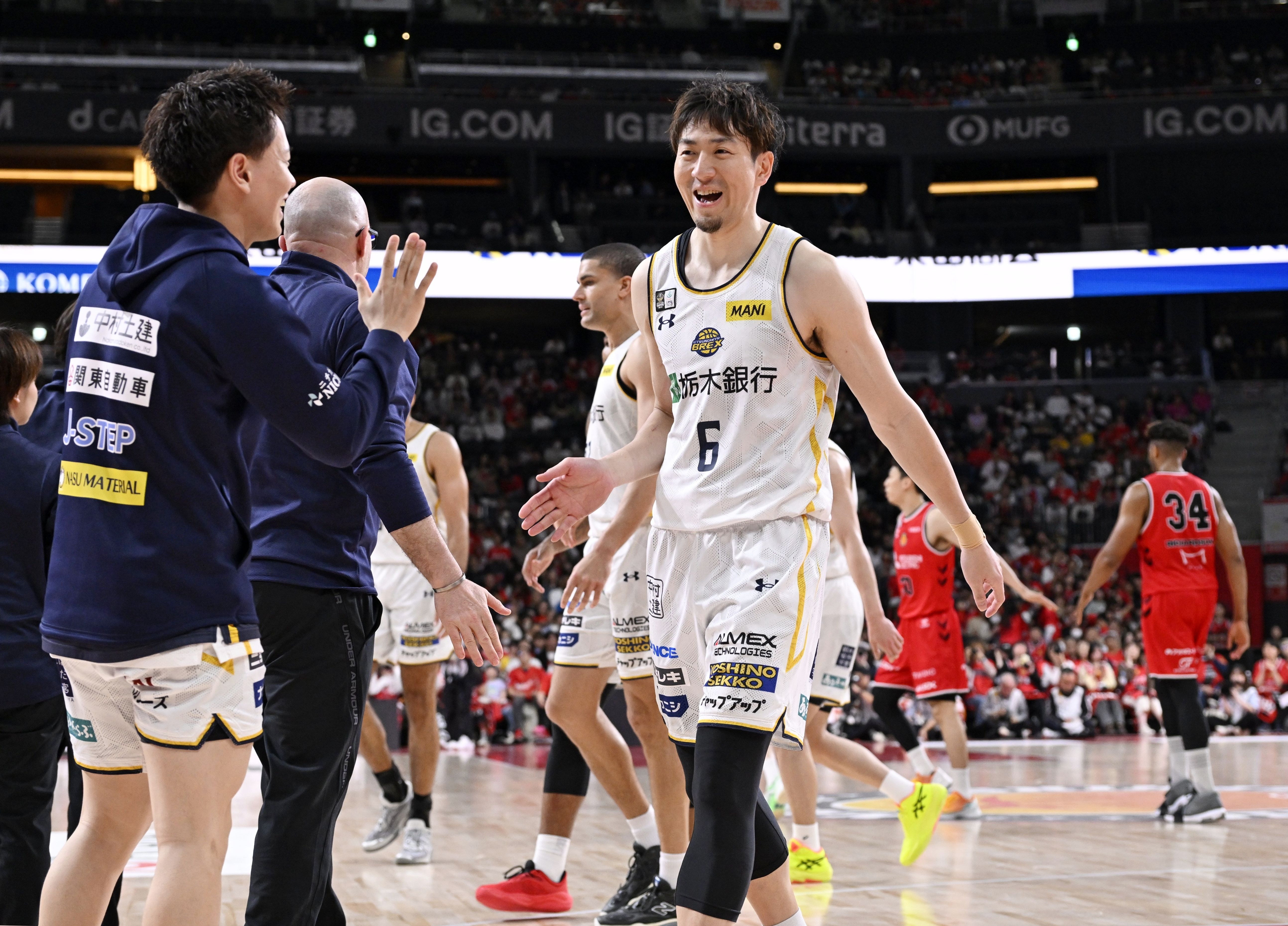 18点リードで前半を終え、笑顔を見せるブレックスの比江島(中央)=26日午後2時、名古屋市のIGアリーナ、森田大地撮影