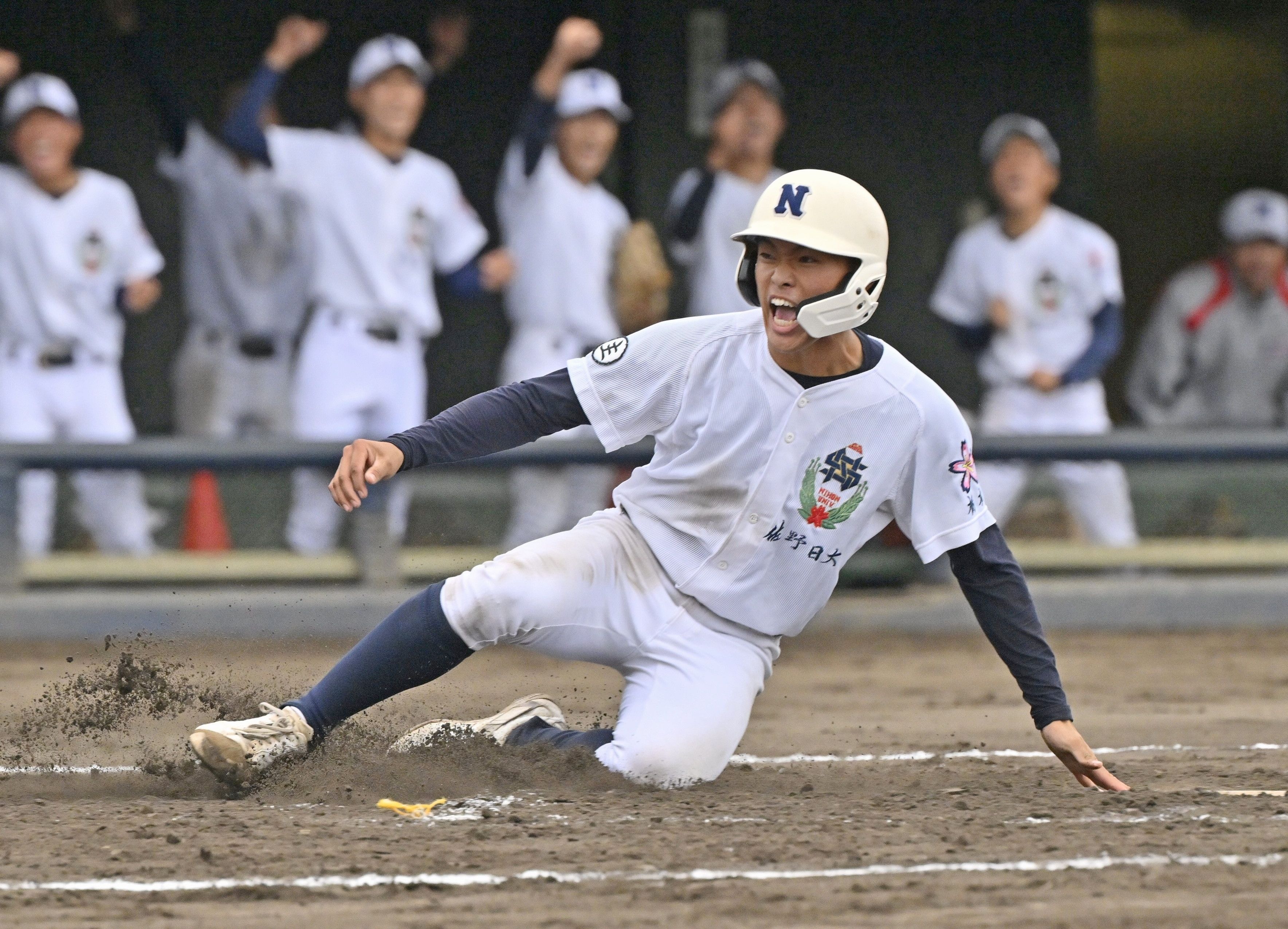 8回、佐野日大・青木の2点適時二塁打で一走の 中村が同点の生還=甲府市の小瀬スポーツ公園山日YBS球場、広瀬華撮影