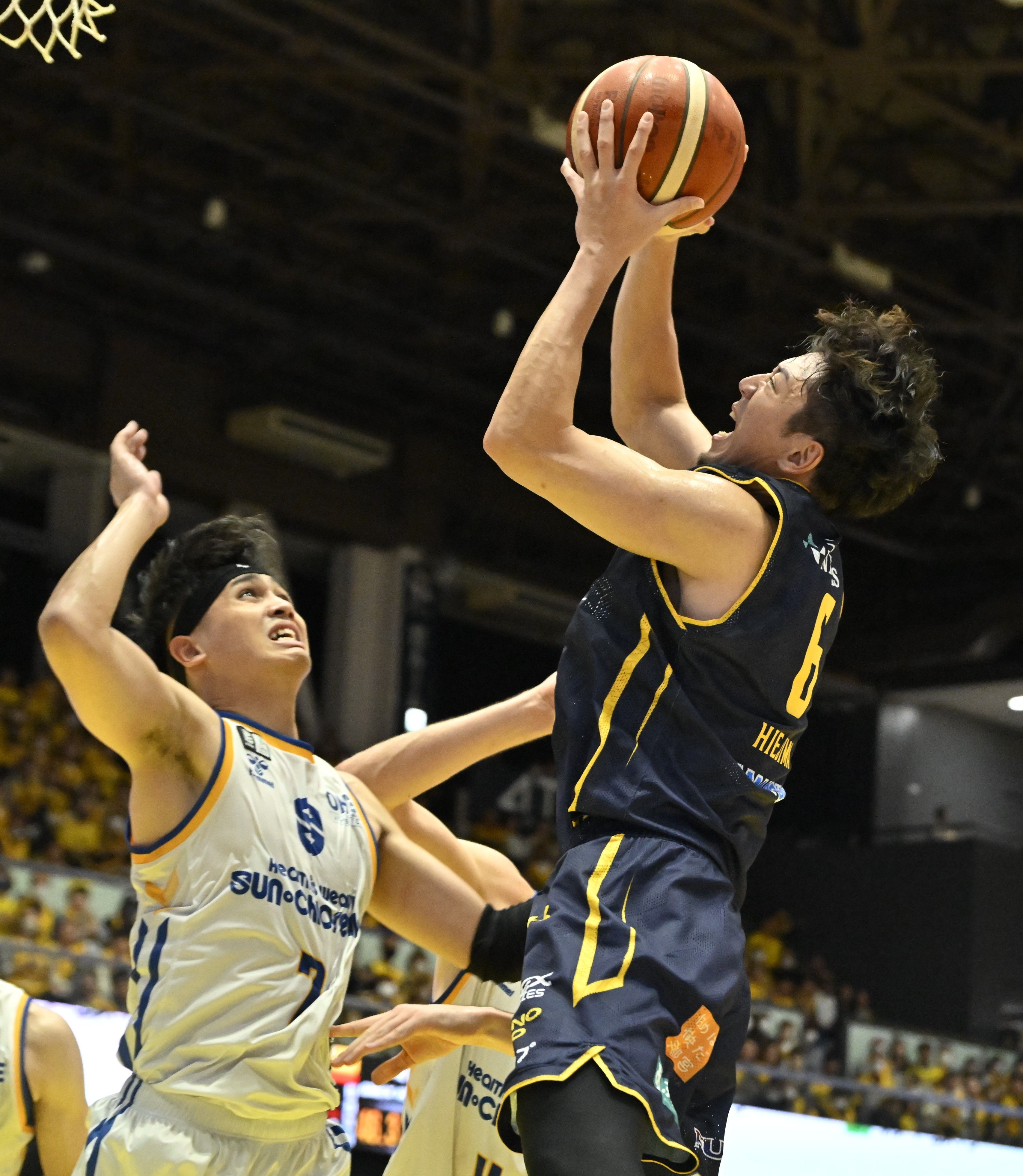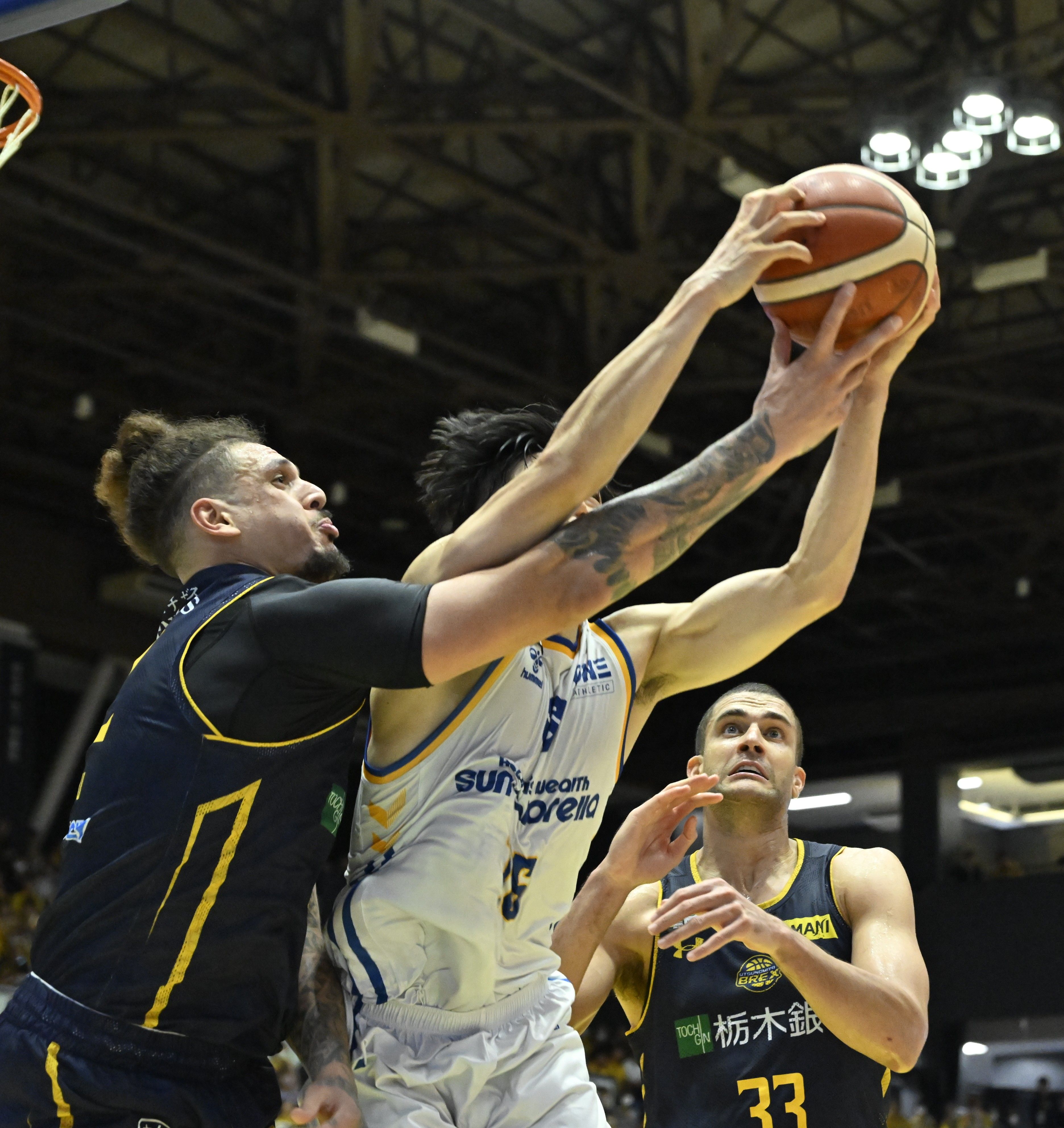 第4クオーター9分、ディフェンスリバウンドを競るブレックスのフォトゥ(左)=ブレックスアリーナ宇都宮、湯田大士撮影