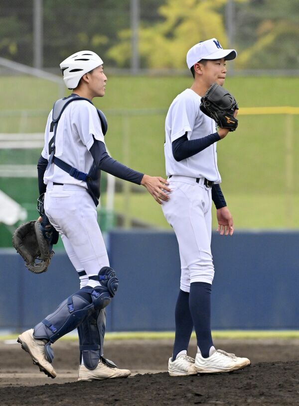 9回、勝ち越しを許し、佐野日大の2番手・沖崎(右)に声をかける捕手・須田=広瀬華撮影