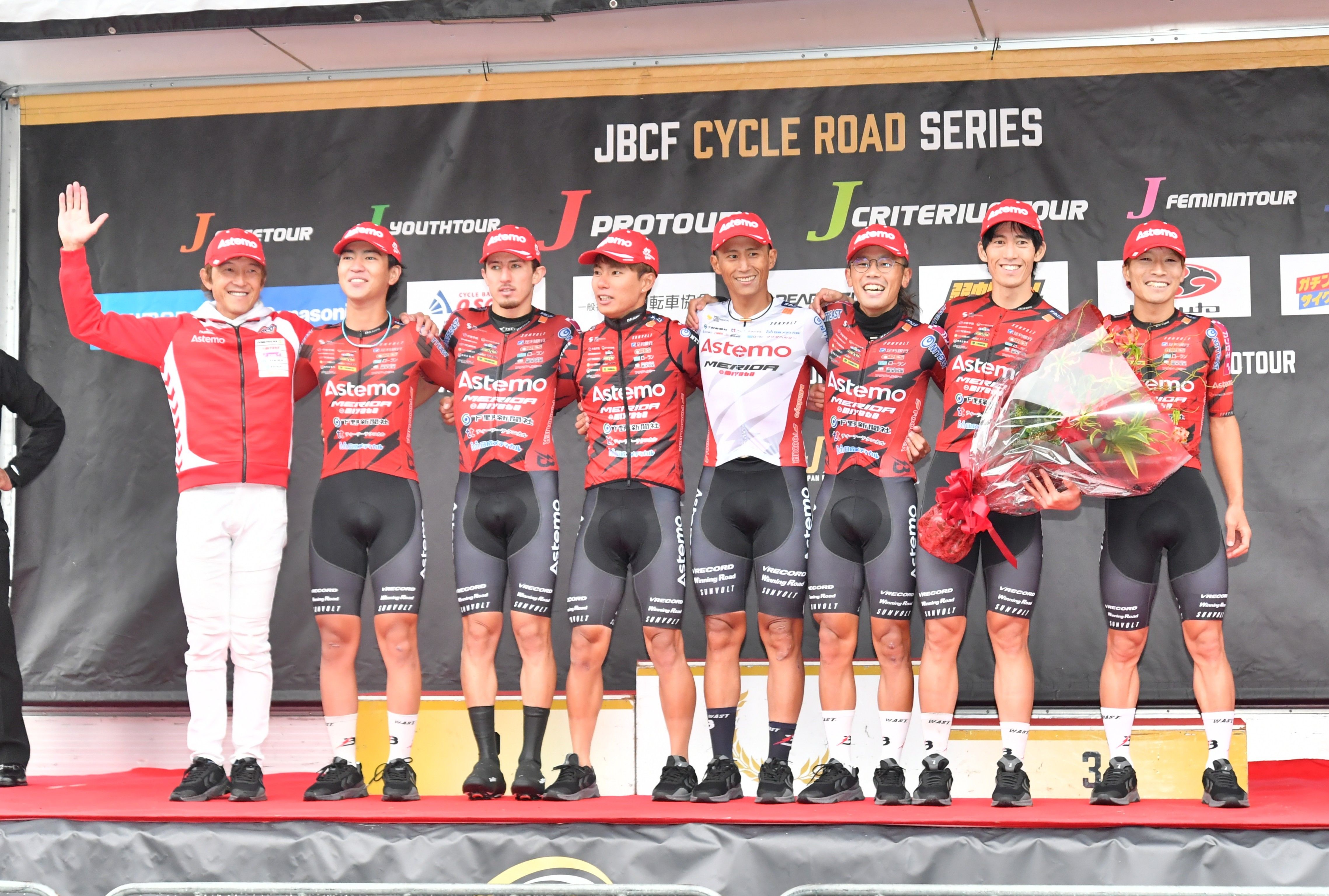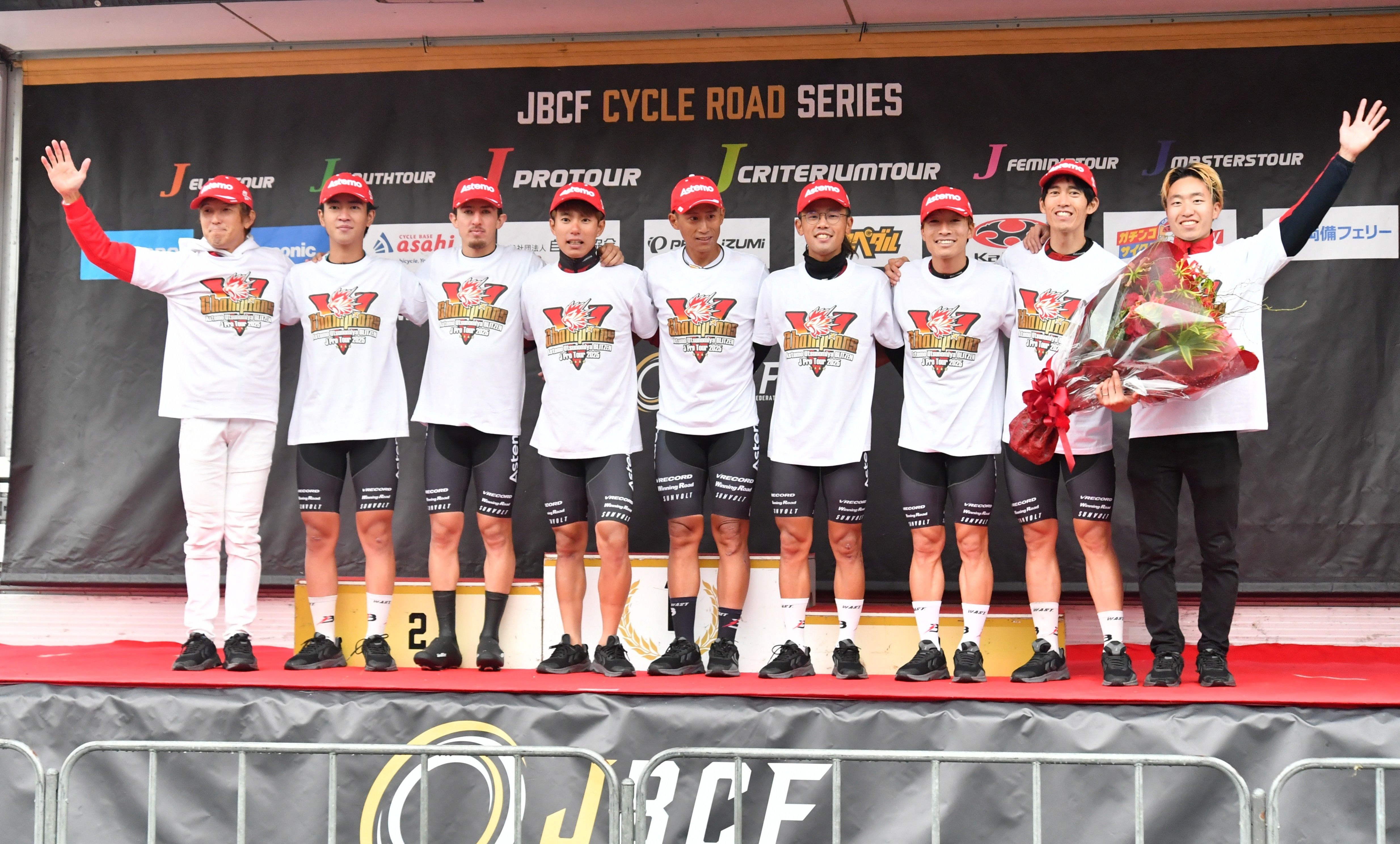 7年ぶり4度目のチーム総合優勝に輝いたブリッツェンの選手たち=25日午後、群馬サイクルスポーツセンター