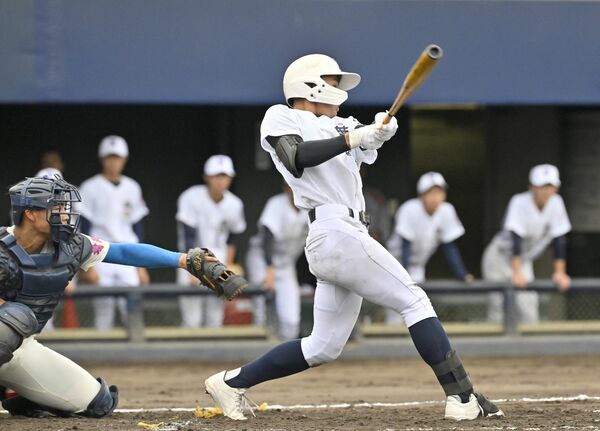 8回、佐野日大の青木が同点とする2点適時二塁打を放つ=甲府市の小瀬スポーツ公園山日YBS球場、広瀬華撮影