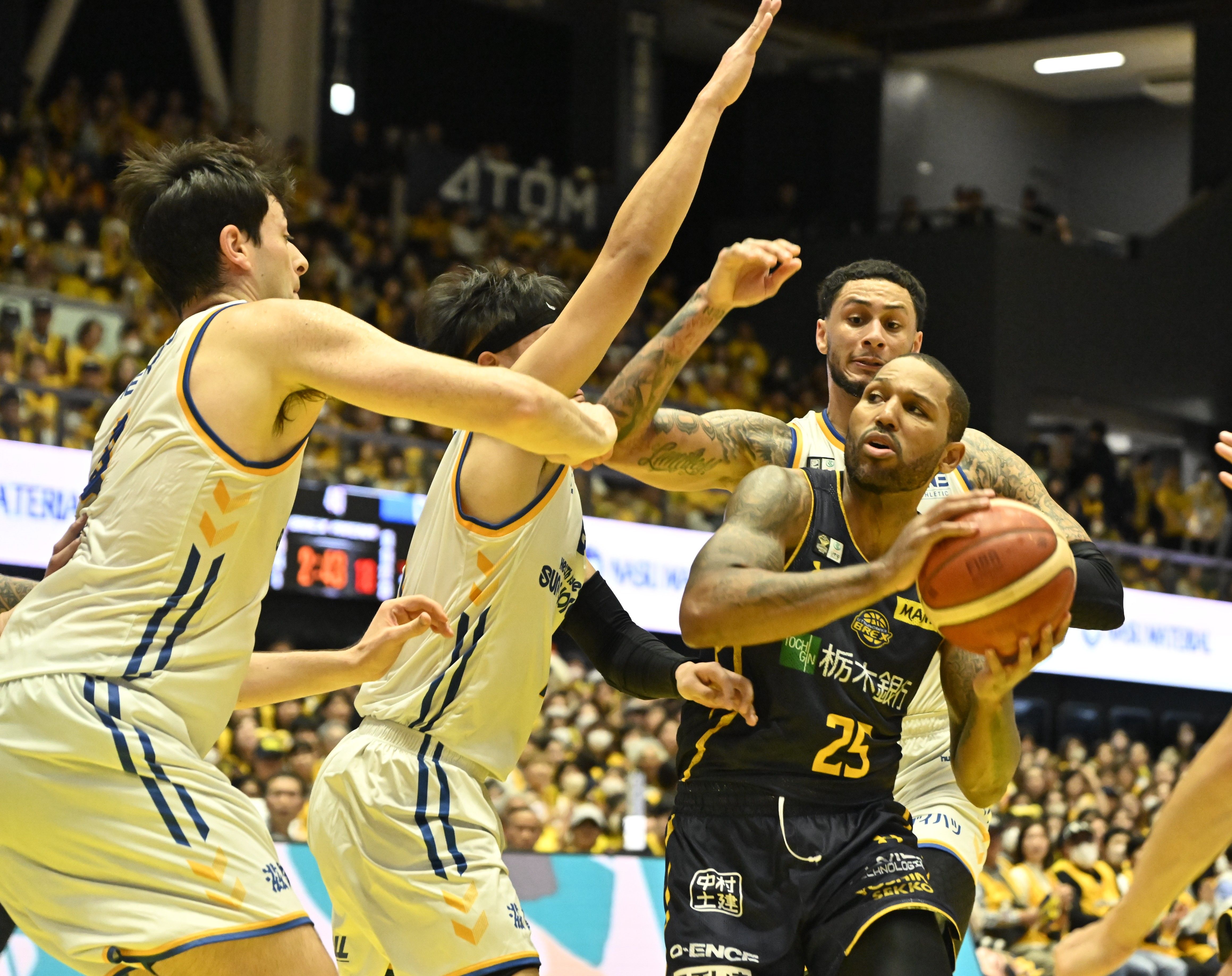 第4クオーター8分、守備に囲まれるブレックスのニュービル=ブレックスアリーナ宇都宮、湯田大士撮影