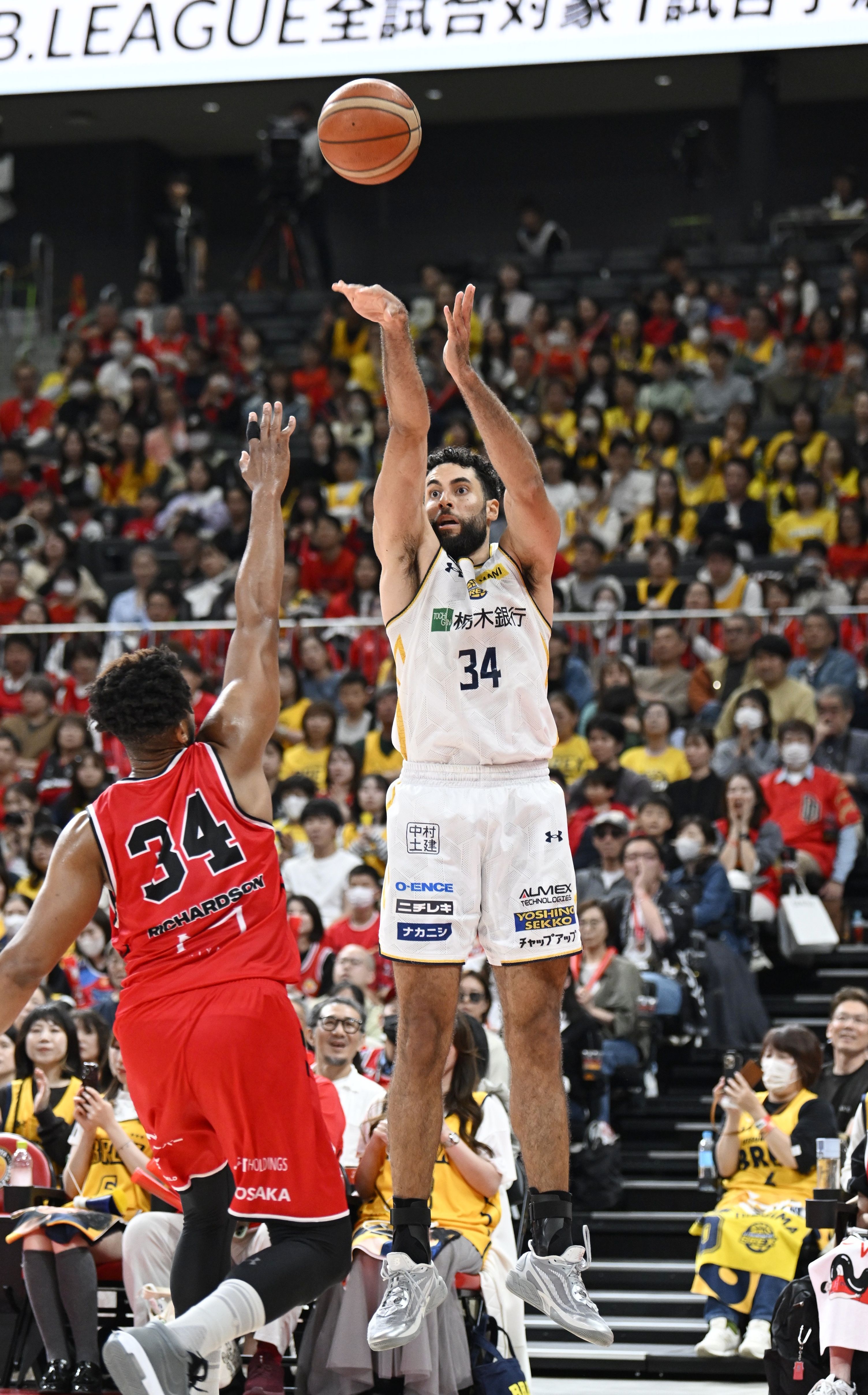 第2クオーター8分、ブレックスのジェレットが3点シュートを決める=IGアリーナ、森田大地撮影