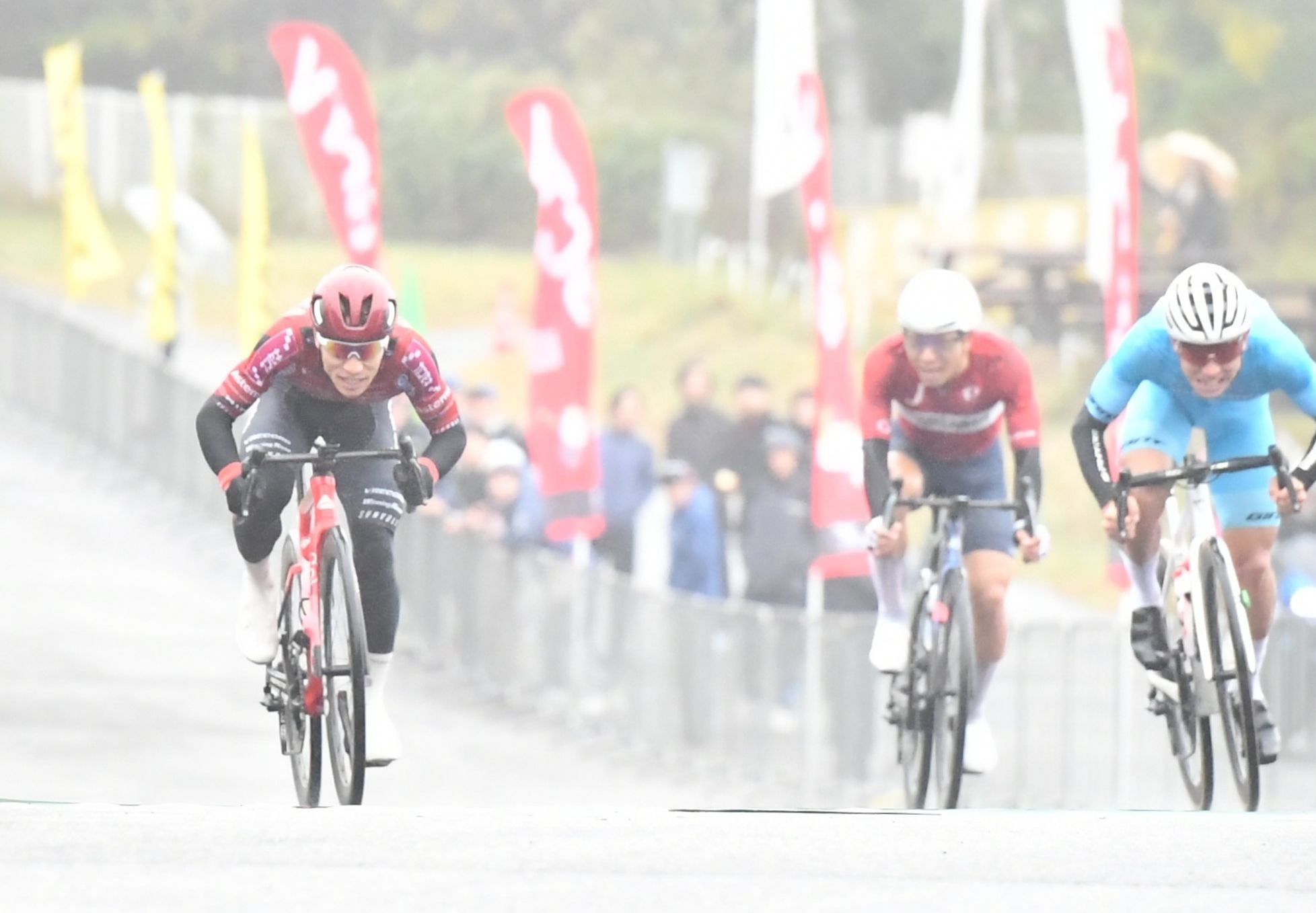 ブリッツェンの岡(左)がゴールスプリントを制し、今季JPT初優勝を飾る=群馬サイクルスポーツセンター