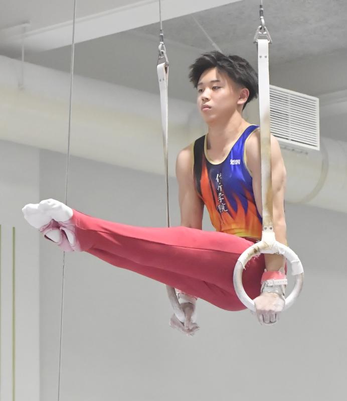 体操男子個人総合1年で優勝した長田(作新)のつり輪の演技=作新学院総合体育館、内藤大地撮影
