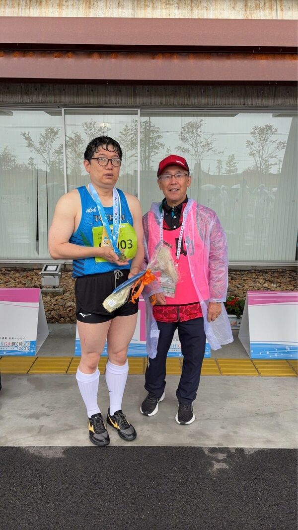 砲丸投げで大会新記録を樹立した市田敬一選手(左)