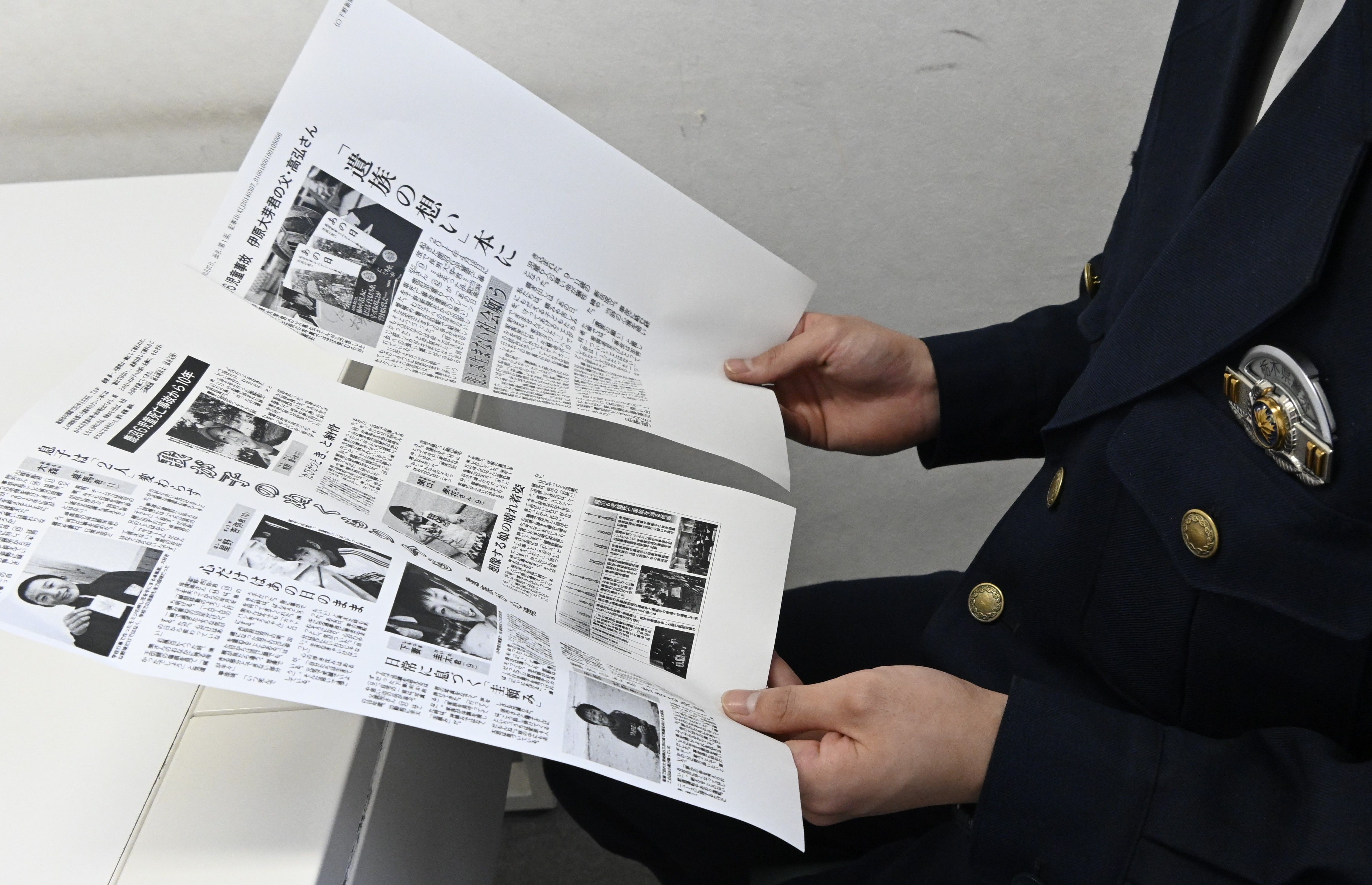 事故に関する新聞記事に目を落とす額賀さん=13日午前、さくら署
