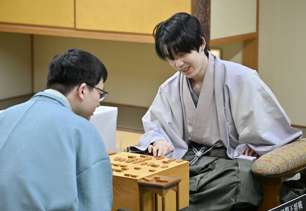 永瀬九段に勝利し、感想戦で笑顔を見せる藤井王将=9日午後6時、大田原市黒羽向町