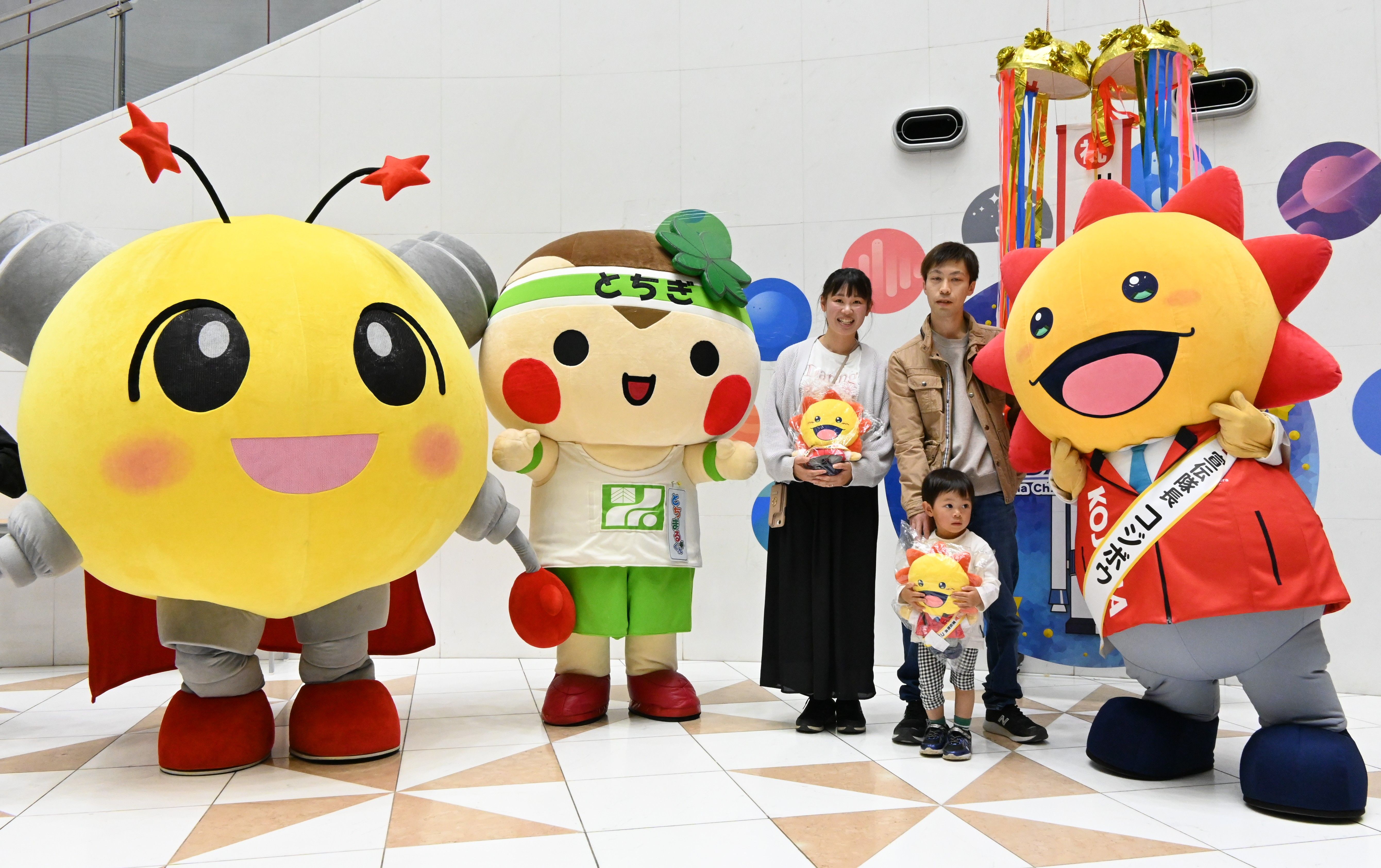 来館者50万人目となった岡田さん一家(中央)=25日午前、宇都宮市西川田町