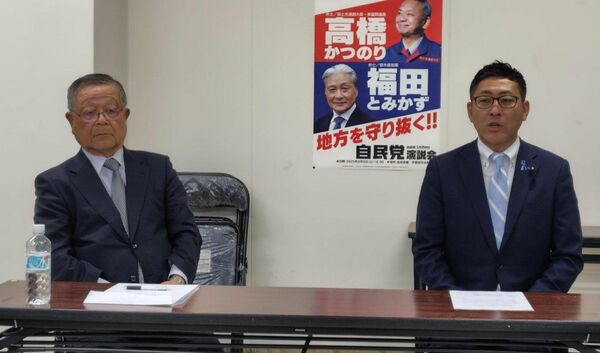 衆院栃木4区の自民候補に内定し、報道陣の取材に応じる石坂氏(右)=17日午後、下野市