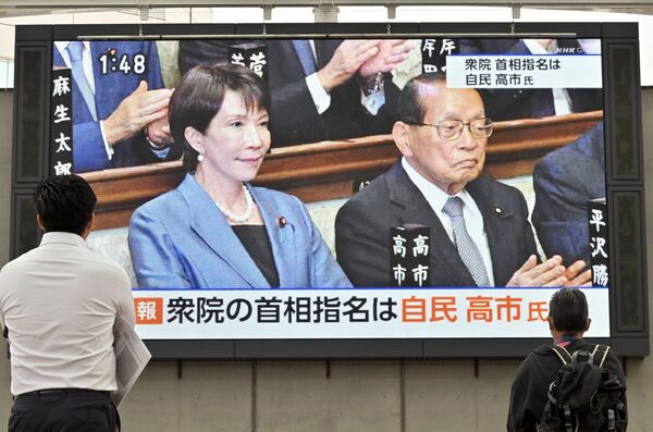 衆院本会議で高市氏が首相に指名されたニュースに見入る県民=21日午後1時50分、宇都宮市江野町