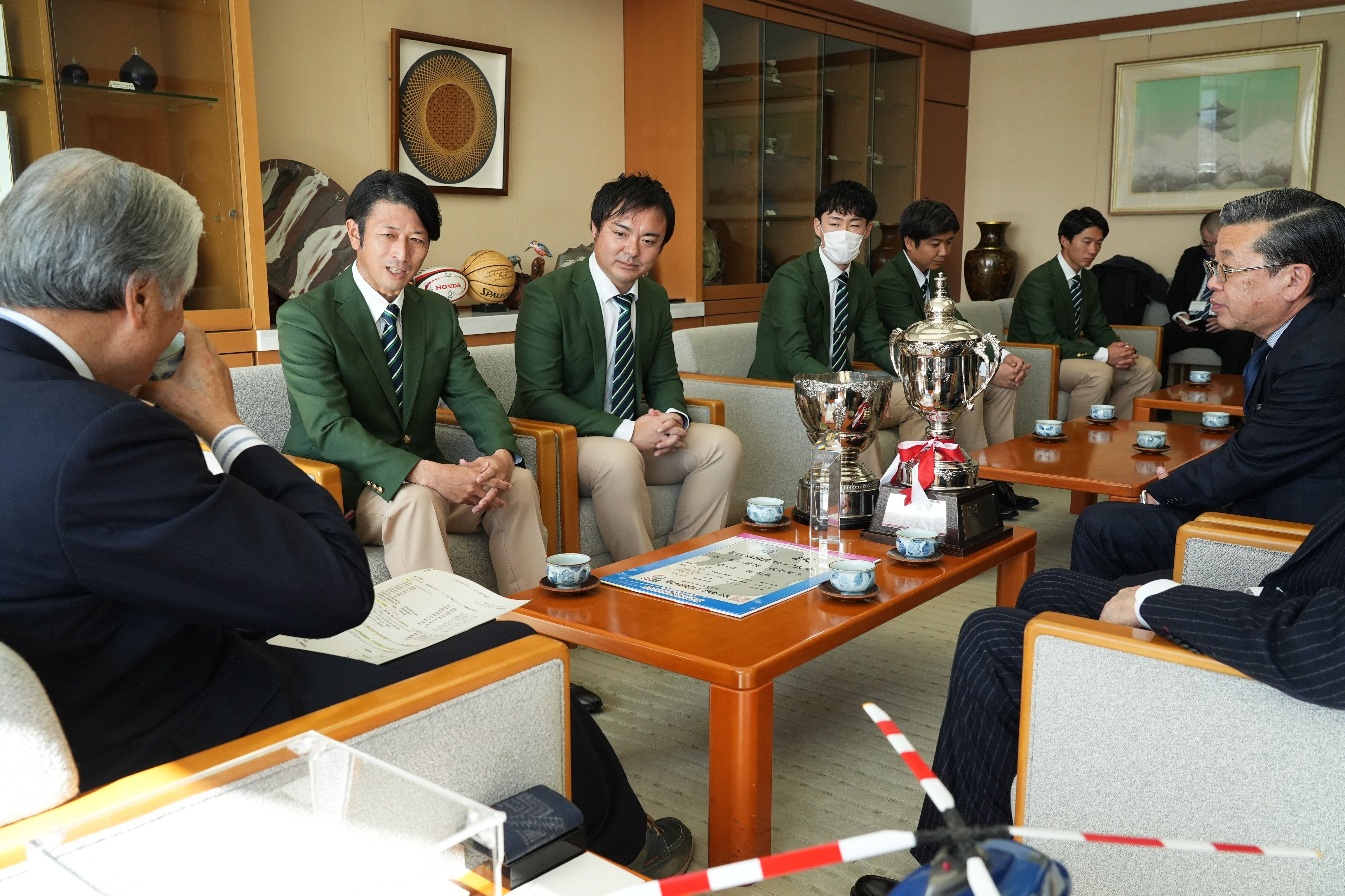 福田知事(左)に25年シーズンの成績を報告する福田ゼネラルマネジャー(左から2人目)と若林監督(同3人目)ら=県庁