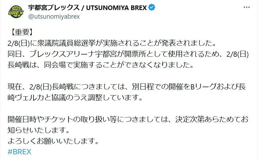 衆院選の開票作業に伴い、試合ができなくなったことを知らせる宇都宮ブレックスのXの投稿