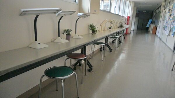 職員室前の廊下には椅子と長テーブル、その上に電気スタンドが並ぶ
